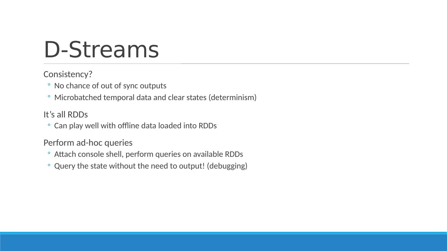 18 .D-Streams Consistency? No chance of out of sync outputs Microbatched temporal data and clear states (determinism) It’s all RDDs Can play well with offline data loaded into RDDs Perform ad-hoc queries Attach console shell, perform queries on available RDDs Query the state without the need to output! (debugging)