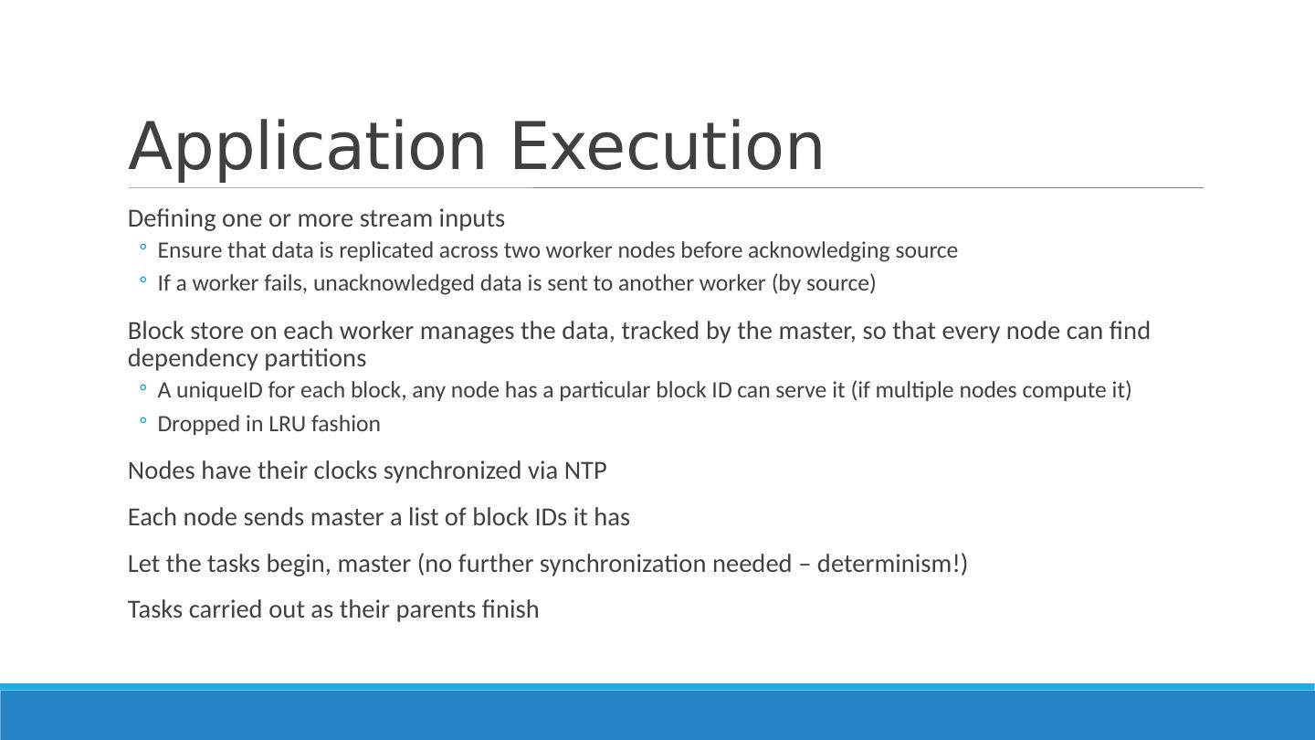 21 .Application Execution Defining one or more stream inputs Ensure that data is replicated across two worker nodes before acknowledging source If a worker fails, unacknowledged data is sent to another worker (by source) Block store on each worker manages the data, tracked by the master, so that every node can find dependency partitions A uniqueID for each block, any node has a particular block ID can serve it (if multiple nodes compute it) Dropped in LRU fashion Nodes have their clocks synchronized via NTP Each node sends master a list of block IDs it has Let the tasks begin, master (no further synchronization needed – determinism!) Tasks carried out as their parents finish