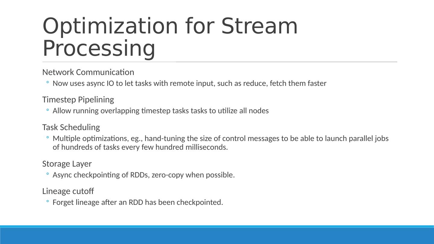23 .Optimization for Stream Processing Network Communication Now uses async IO to let tasks with remote input, such as reduce, fetch them faster Timestep Pipelining Allow running overlapping timestep tasks tasks to utilize all nodes Task Scheduling Multiple optimizations, eg ., hand-tuning the size of control messages to be able to launch parallel jobs of hundreds of tasks every few hundred milliseconds. Storage Layer Async checkpointing of RDDs, zero-copy when possible. Lineage cutoff Forget lineage after an RDD has been checkpointed .