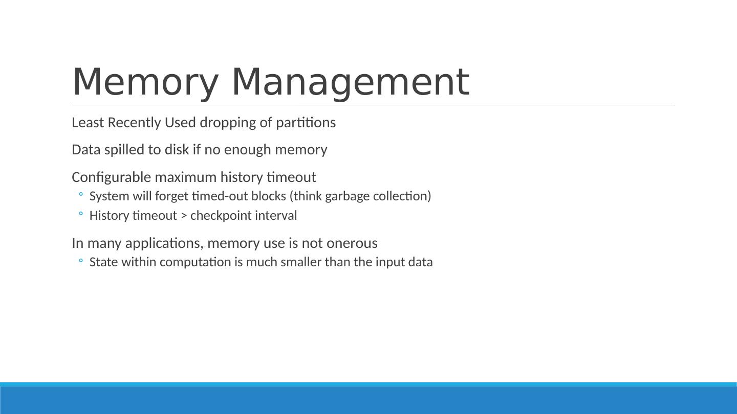25 .Memory Management Least Recently Used dropping of partitions Data spilled to disk if no enough memory Configurable maximum history timeout System will forget timed-out blocks (think garbage collection) History t imeout > checkpoint interval In many applications, memory use is not onerous State within computation is much smaller than the input data