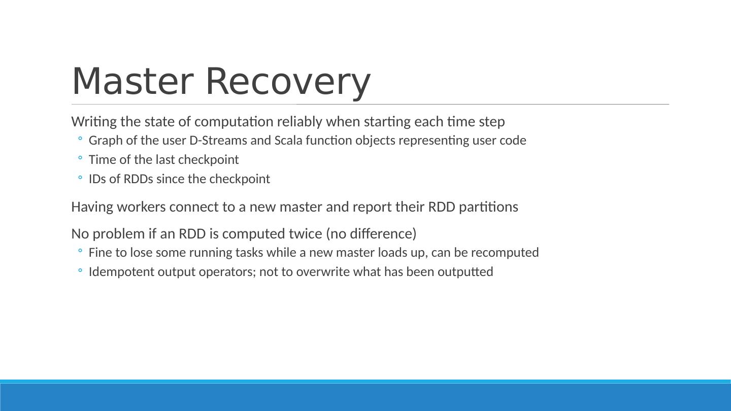29 .Master Recovery Writing the state of computation reliably when starting each time step Graph of the user D-Streams and Scala function objects representing user code Time of the last checkpoint IDs of RDDs since the checkpoint Having workers connect to a new master and report their RDD partitions No problem if an RDD is computed twice (no difference) Fine to lose some running tasks while a new master loads up, can be recomputed Idempotent output operators; not to overwrite what has been outputted