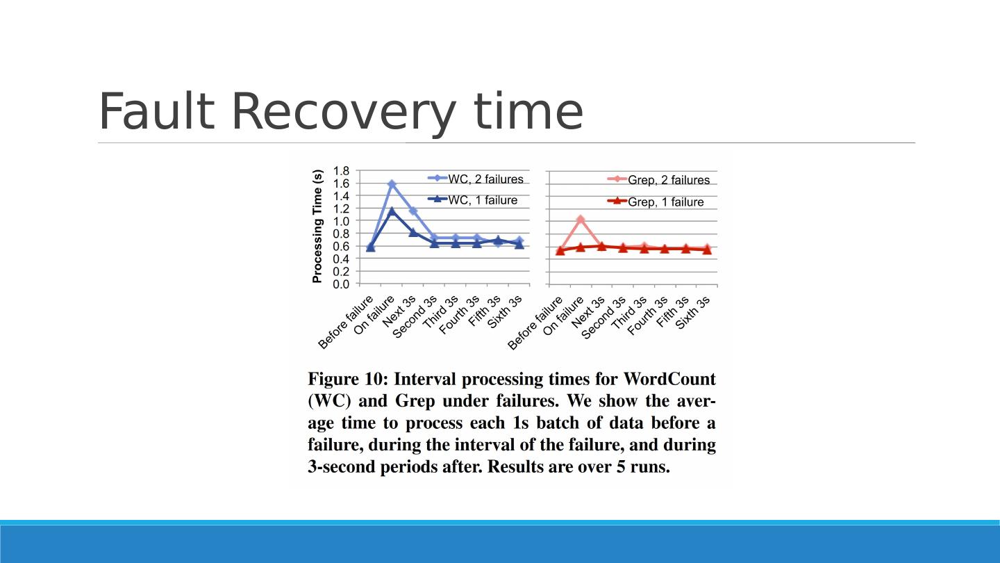 26 .Fault Recovery Deterministic nature of D-Streams allows parallel recovery RDDs are immutable State is fully explicit Fine-granularity dependencies Regular checkpoints helps speed up recomputations Parallel Recovery A node fails -> different partitions in different RDDs are lost Master identifies lost partitions and sends out tasks to nodes to recompute time according to lineage and dependencies The whole cluster partakes in recovery Parallel both in partitions in each timestep and across timesteps (if dependency allows)