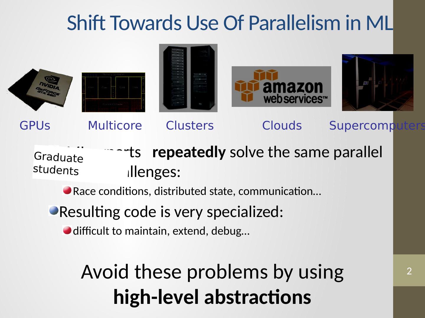 2 .2 Shift Towards Use Of Parallelism in ML ML experts repeatedly solve the same parallel design challenges: Race conditions, distributed state, communication… Resulting code is very specialized: difficult to maintain, extend, debug… GPUs Multicore Clusters Clouds Supercomputers Graduate students Avoid these problems by using high-level abstractions