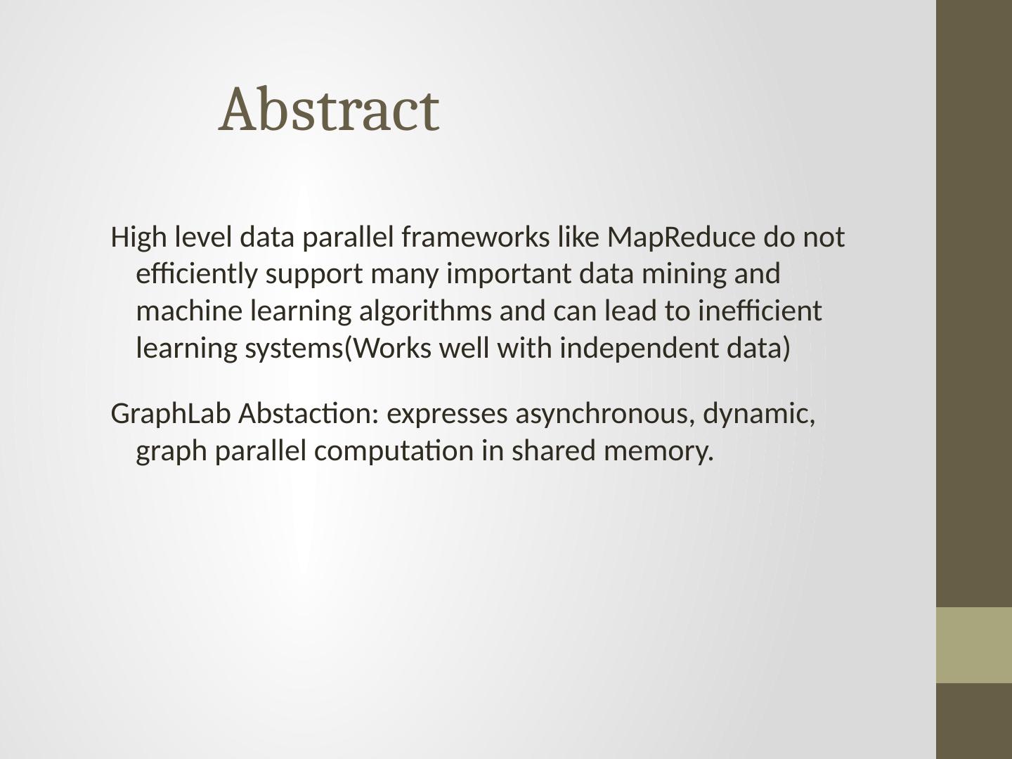 3 .Abstract High level data parallel frameworks like MapReduce do not efficiently support many important data mining and machine learning algorithms and can lead to inefficient learning systems(Works well with independent data) GraphLab Abstaction : expresses asynchronous, dynamic, graph parallel computation in shared memory.
