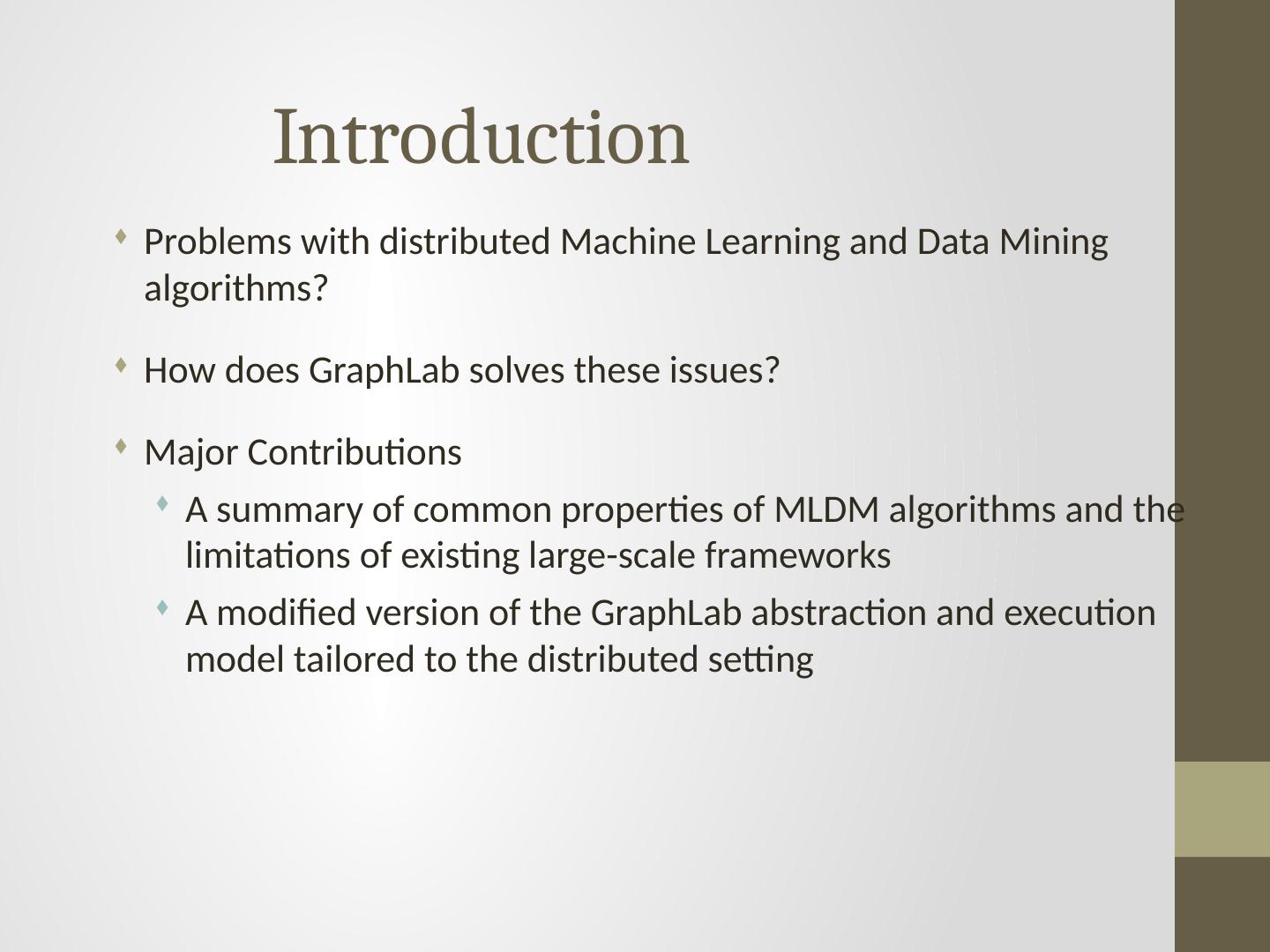4 .Introduction Problems with distributed Machine Learning and Data Mining algorithms? How does GraphLab solves these issues? Major Contributions A summary of common properties of MLDM algorithms and the limitations of existing large-scale frameworks A modified version of the GraphLab abstraction and execution model tailored to the distributed setting