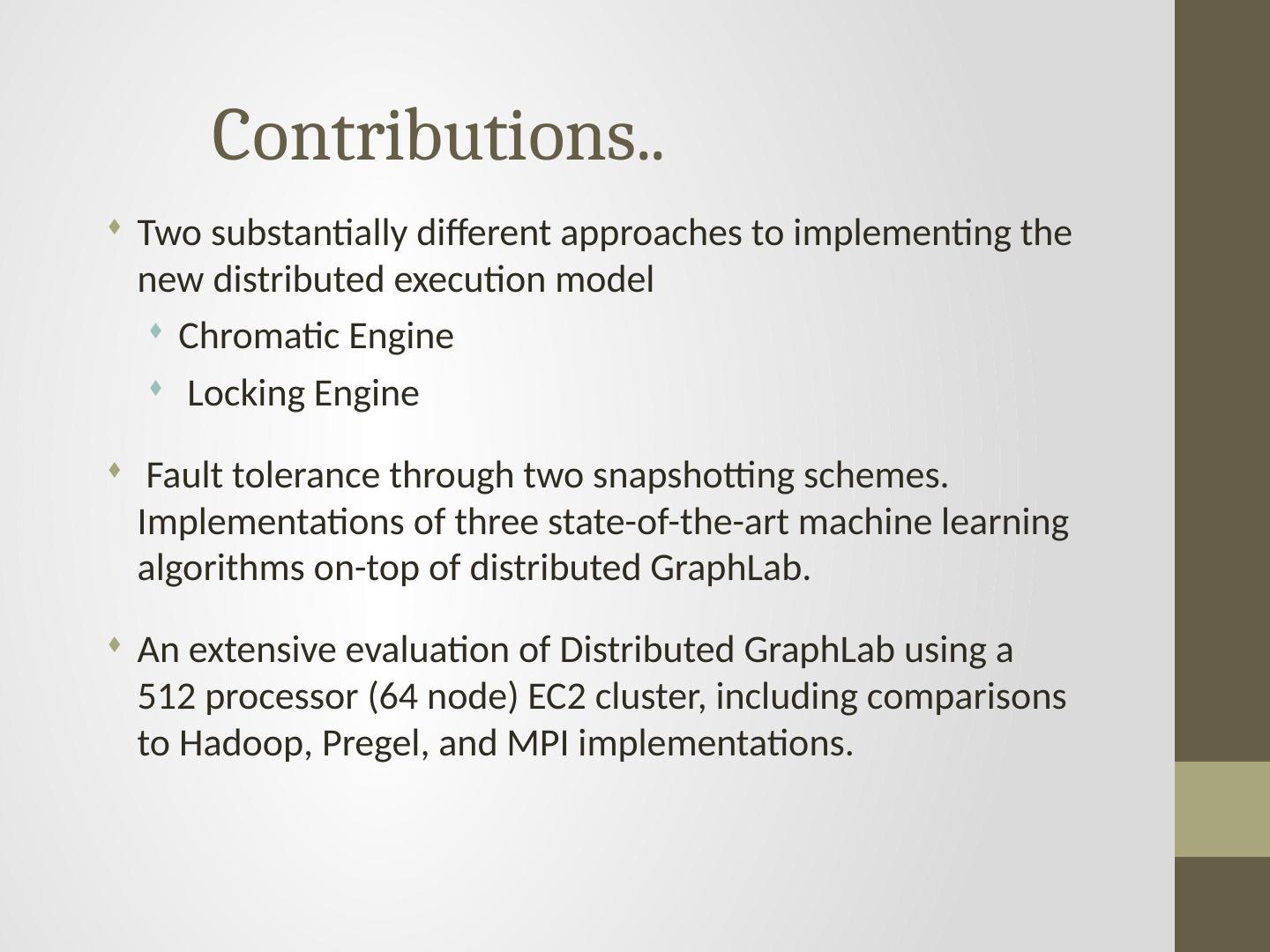 5 . Contributions .. Two substantially different approaches to implementing the new distributed execution model Chromatic Engine Locking Engine Fault tolerance through two snapshotting schemes. Implementations of three state-of-the-art machine learning algorithms on-top of distributed GraphLab . An extensive evaluation of Distributed GraphLab using a 512 processor (64 node) EC2 cluster, including comparisons to Hadoop , Pregel , and MPI implementations.