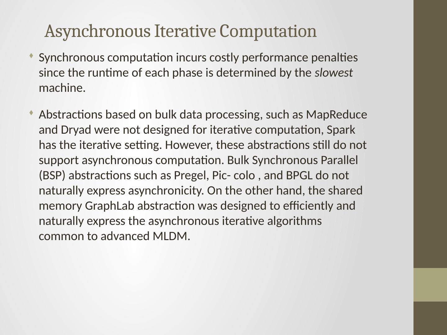 8 .Asynchronous Iterative Computation Synchronous computation incurs costly performance penalties since the runtime of each phase is determined by the slowest machine. Abstractions based on bulk data processing, such as MapReduce and Dryad were not designed for iterative computation, Spark has the iterative setting. However, these abstractions still do not support asynchronous computation. Bulk Synchronous Parallel (BSP) abstractions such as Pregel , Pic- colo , and BPGL do not naturally express asynchronicity . On the other hand, the shared memory GraphLab abstraction was designed to efficiently and naturally express the asynchronous iterative algorithms common to advanced MLDM.