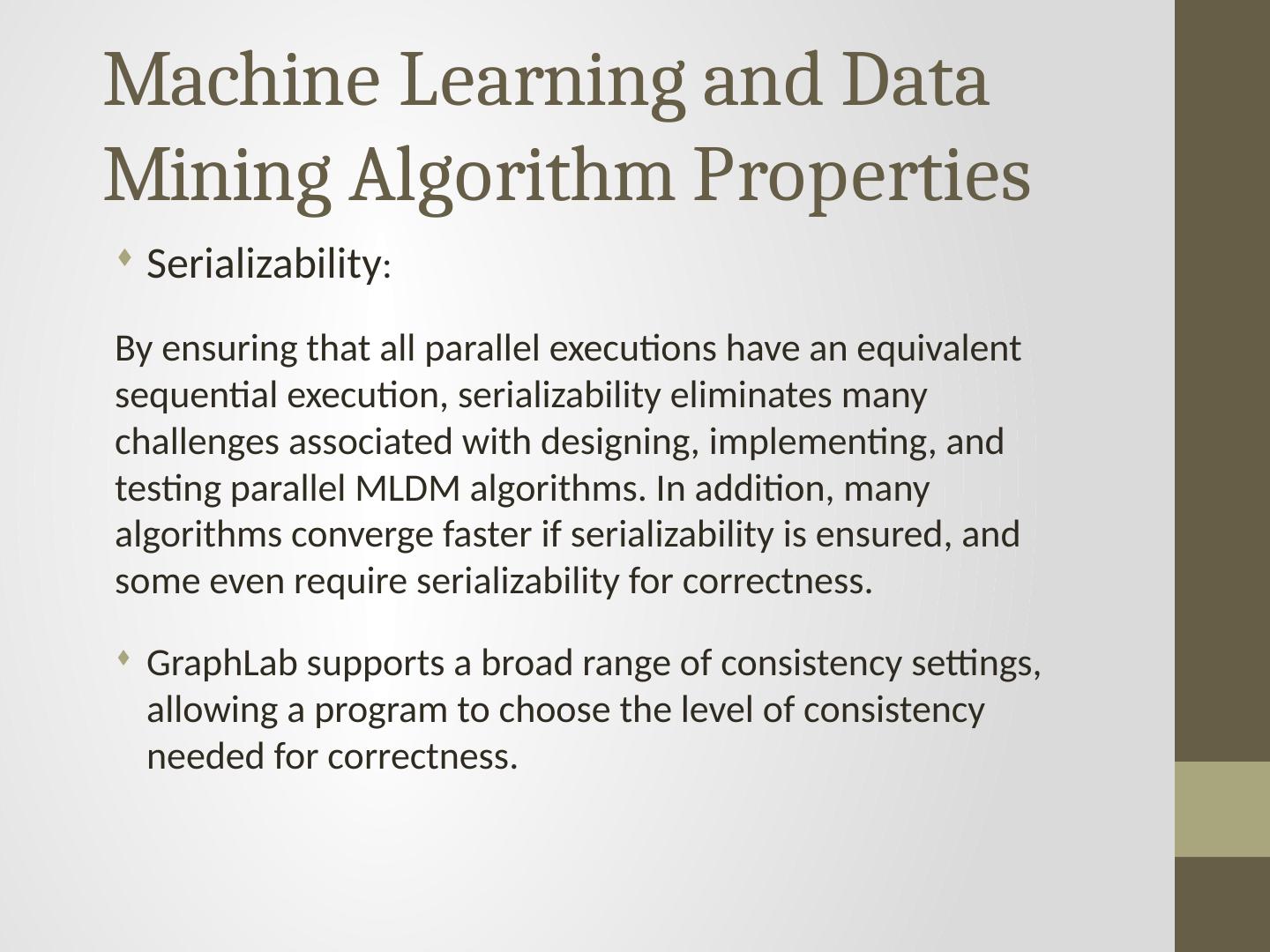 11 .Machine Learning and Data Mining Algorithm Properties Serializability : By ensuring that all parallel executions have an equivalent sequential execution, serializability eliminates many challenges associated with designing, implementing, and testing parallel MLDM algorithms. In addition, many algorithms converge faster if serializability is ensured, and some even require serializability for correctness. GraphLab supports a broad range of consistency settings, allowing a program to choose the level of consistency needed for correctness.