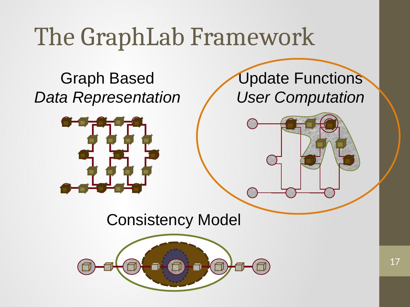 17 .17 The GraphLab Framework Consistency Model Graph Based Data Representation Update Functions User Computation