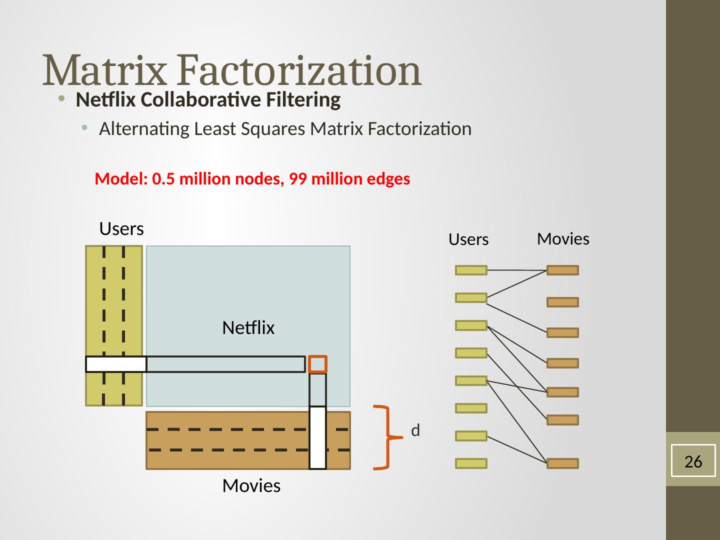 26 .Matrix Factorization Netflix Collaborative Filtering Alternating Least Squares Matrix Factorization M odel : 0.5 million nodes, 99 million edges Netflix Users Movies d 26 Users Movies