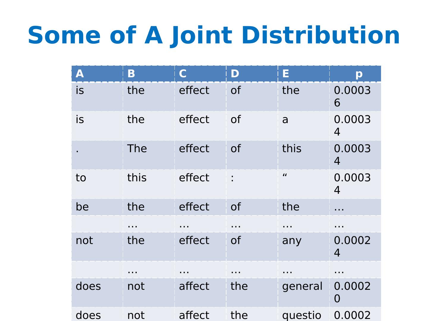 6 .Some of A Joint Distribution A B C D E p is the effect of the 0.00036 is the effect of a 0.00034 . The effect of this 0.00034 to this effect : “ 0.00034 be the effect of the … … … … … … not the effect of any 0.00024 … … … … … does not affect the general 0.00020 does not affect the question 0.00020 any manner affect the principle 0.00018