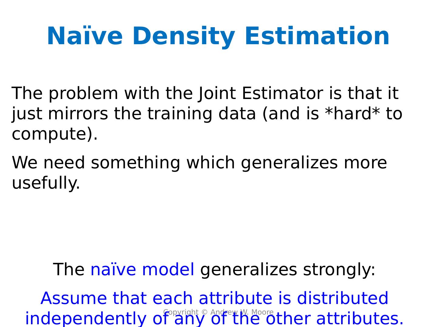 8 .Copyright © Andrew W. Moore Naïve Density Estimation The problem with the Joint Estimator is that it just mirrors the training data (and is *hard* to compute). We need something which generalizes more usefully. The naïve model generalizes strongly: Assume that each attribute is distributed independently of any of the other attributes.
