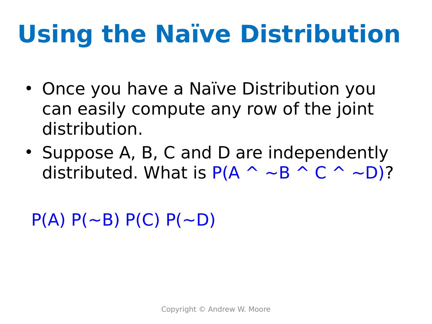 9 .Copyright © Andrew W. Moore Using the Naïve Distribution Once you have a Naïve Distribution you can easily compute any row of the joint distribution. Suppose A, B, C and D are independently distributed. What is P(A ^ ~B ^ C ^ ~D) ?