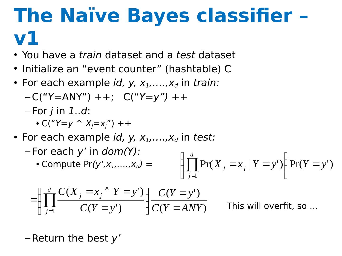18 .The Naïve Bayes classifier – v1 You have a train dataset and a test dataset Initialize an “event counter” ( hashtable ) C For each example id, y, x 1 ,…., x d in train: C(“ Y =ANY”) ++; C(“ Y=y”) ++ For j in 1..d : C(“ Y=y ^ X j = x j ”) ++ For each example id, y, x 1 ,…., x d in test: For each y’ in dom (Y): Compute Pr (y’,x 1 ,…., x d ) = Return the best y’ This will overfit , so …