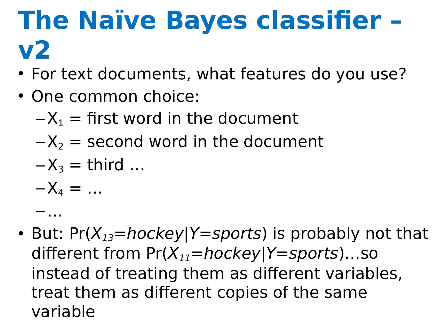 21 .The Naïve Bayes classifier – v2 For text documents, what features do you use? One common choice: X 1 = first word in the document X 2 = second word in the document X 3 = third … X 4 = … … But: Pr( X 13 = hockey|Y =sports ) is probably not that different from Pr( X 11 = hockey|Y =sports )…so instead of treating them as different variables, treat them as different copies of the same variable