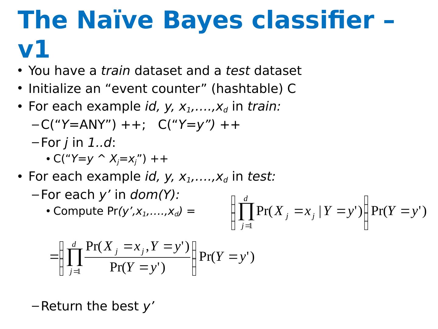 17 .The Naïve Bayes classifier – v1 You have a train dataset and a test dataset Initialize an “event counter” ( hashtable ) C For each example id, y, x 1 ,…., x d in train: C(“ Y =ANY”) ++; C(“ Y=y”) ++ For j in 1..d : C(“ Y=y ^ X j = x j ”) ++ For each example id, y, x 1 ,…., x d in test: For each y’ in dom (Y): Compute Pr (y’,x 1 ,…., x d ) = Return the best y’
