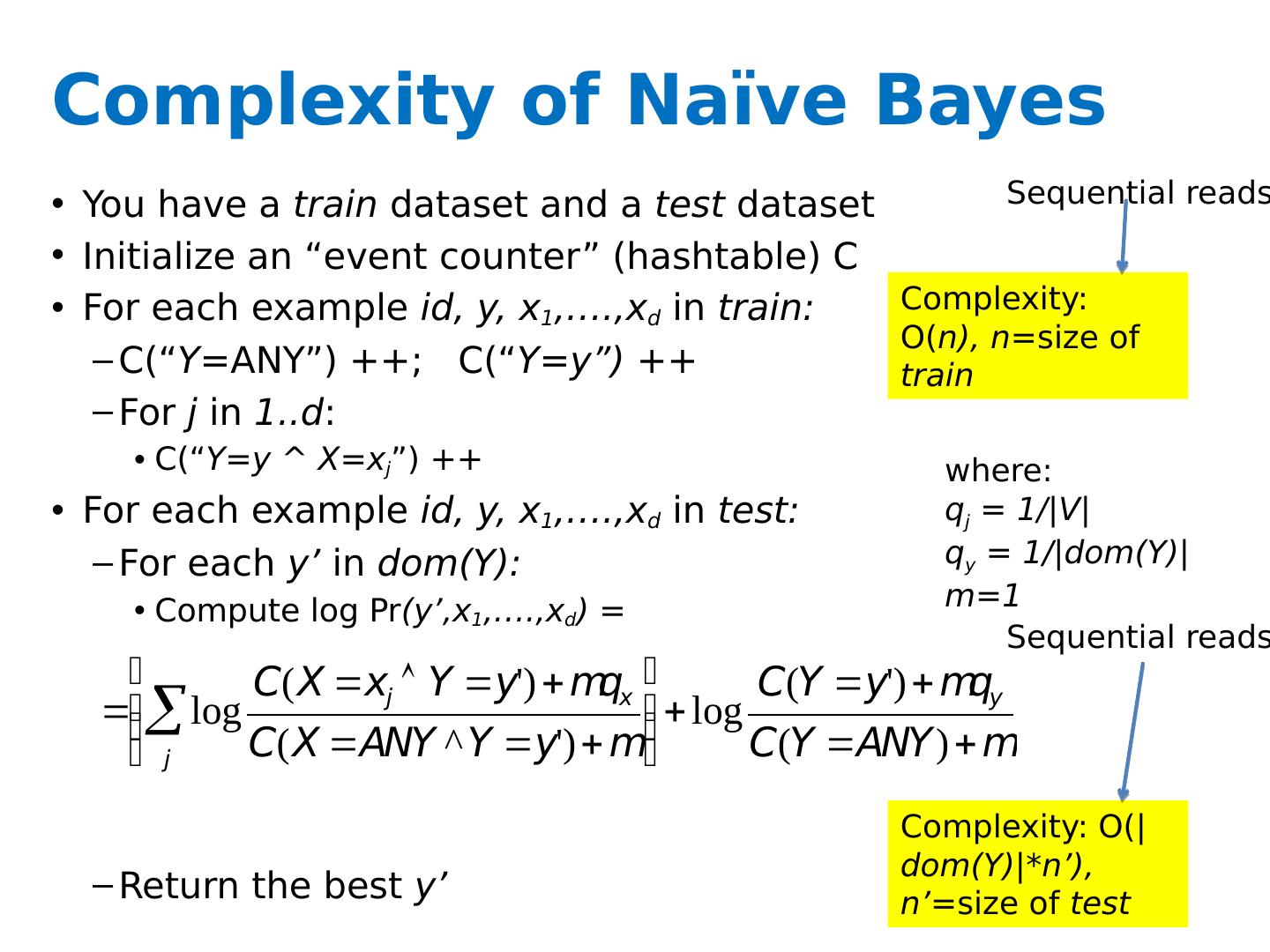 26 .Complexity of Naïve Bayes You have a train dataset and a test dataset Initialize an “event counter” ( hashtable ) C For each example id, y, x 1 ,…., x d in train: C(“ Y =ANY”) ++; C(“ Y=y”) ++ For j in 1..d : C(“ Y=y ^ X= x j ”) ++ For each example id, y, x 1 ,…., x d in test: For each y’ in dom (Y): Compute log Pr (y’,x 1 ,…., x d ) = Return the best y’ where: q j = 1/|V| q y = 1/| dom (Y)| m=1 Complexity: O( n), n= size of train Complexity: O(| dom (Y)|*n’), n’= size of test Sequential reads Sequential reads
