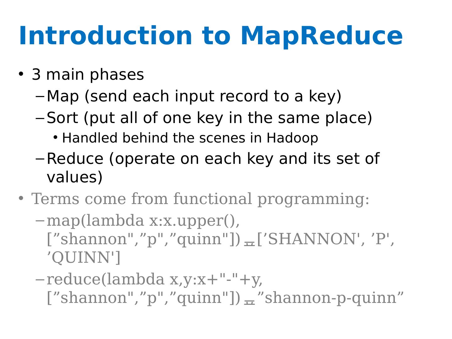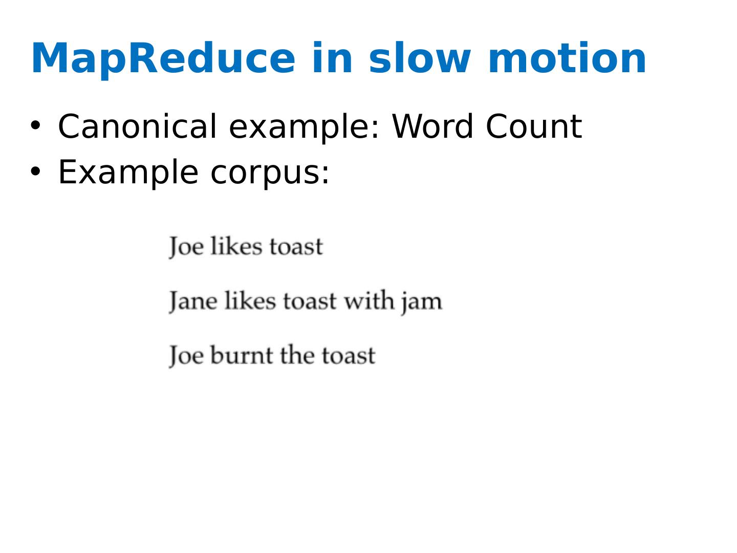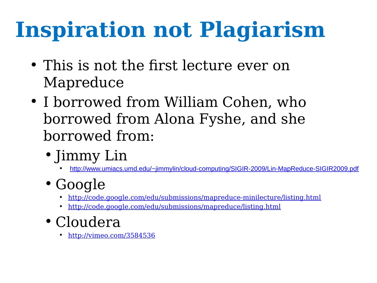 29 .Inspiration not Plagiarism This is not the first lecture ever on Mapreduce I borrowed from William Cohen, who borrowed from Alona Fyshe , and she borrowed from: Jimmy Lin http://www.umiacs.umd.edu/~jimmylin/cloud-computing/SIGIR-2009/Lin-MapReduce-SIGIR2009.pdf Google http://code.google.com/edu/submissions/mapreduce-minilecture/listing.html http://code.google.com/edu/submissions/mapreduce/listing.html Cloudera http://vimeo.com/3584536