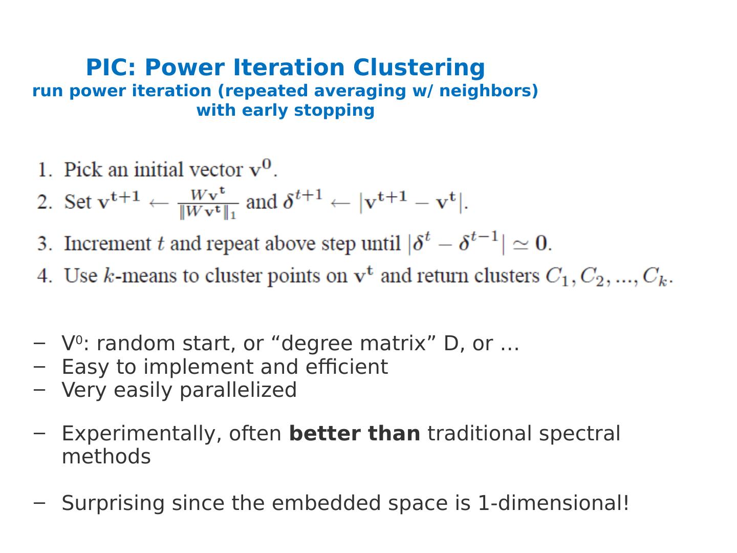 28 .Repeated averaging with neighbors on a sample problem… Create a graph, connecting all points in the 2-D initial space to all other points Weighted by distance Run power iteration for 10 steps Plot node id x vs v 10 (x) nodes are ordered by actual cluster number b b b b b g g g g g g g g g r r r r r r r … blue green ___red___