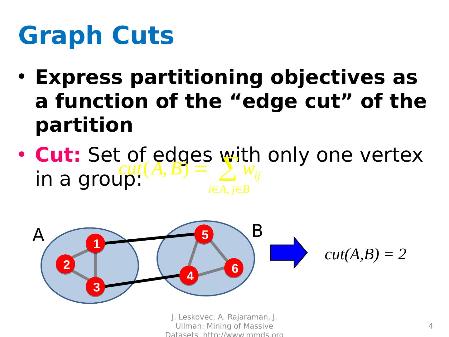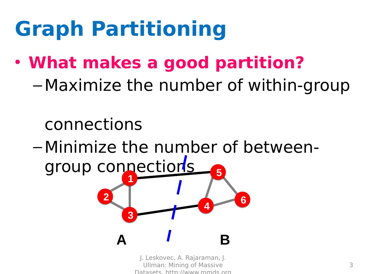 3 .Graph Partitioning What makes a good partition? Maximize the number of within-group connections Minimize the number of between-group connections J. Leskovec, A. Rajaraman, J. Ullman: Mining of Massive Datasets, http://www.mmds.org 3 1 3 2 5 4 6 A B