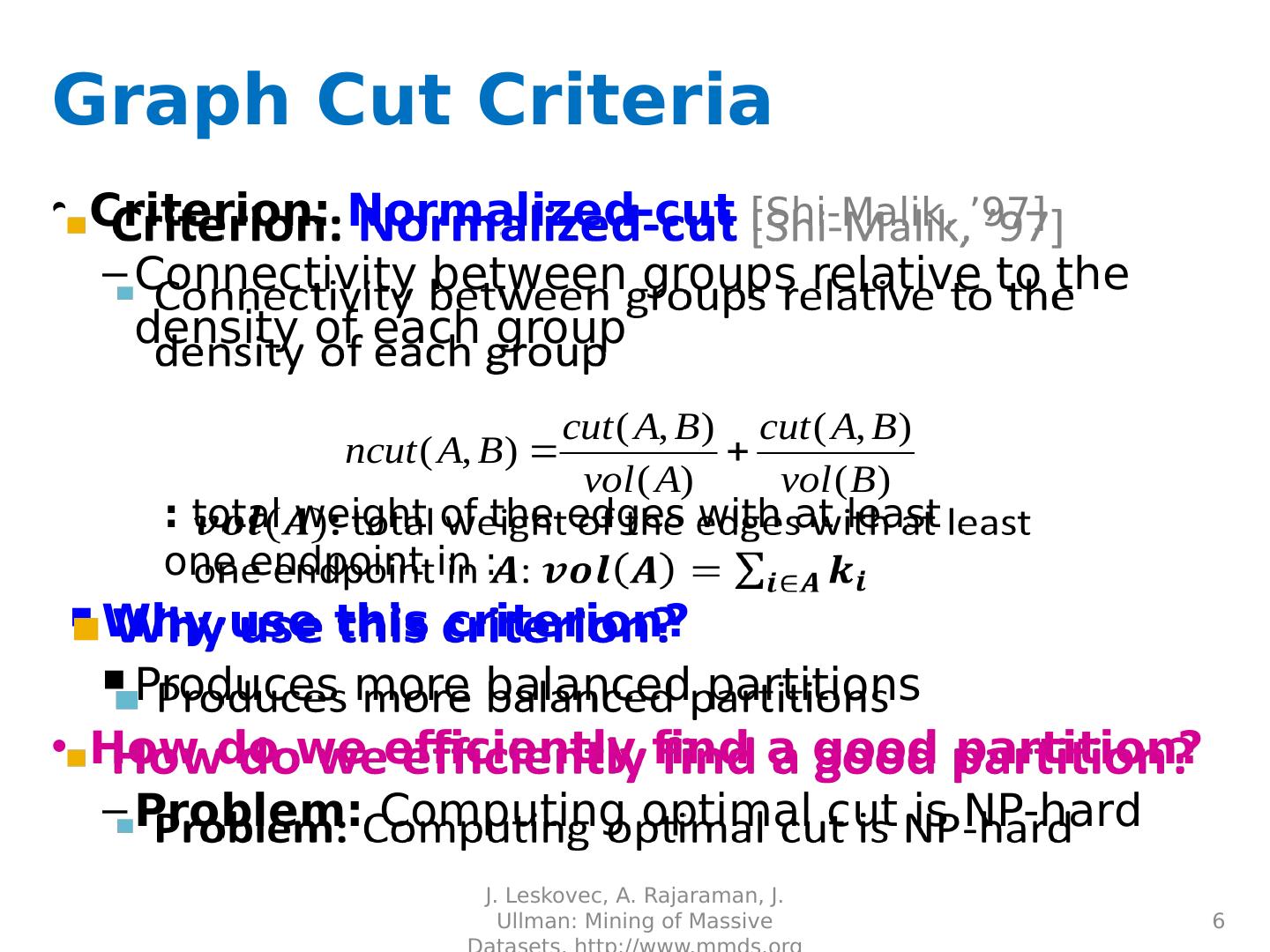 5 .Graph Cut Criterion Criterion: Minimum-cut Minimize weight of connections between groups Degenerate case: Problem: Only considers external cluster connections Does not consider internal cluster connectivity J. Leskovec, A. Rajaraman, J. Ullman: Mining of Massive Datasets, http://www.mmds.org 5 a rg min A,B cut(A,B) “Optimal cut” Minimum cut