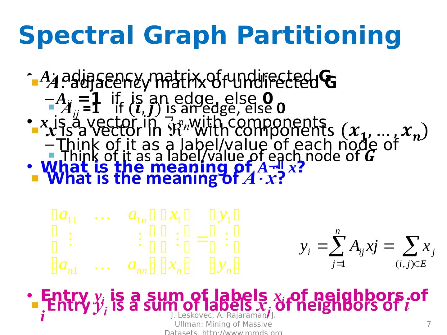 7 .Spectral Graph Partitioning A : adjacency matrix of undirected G A ij =1 if is an edge, else 0 x is a vector in n with components Think of it as a label/value of each node of What is the meaning of A x ? Entry y i is a sum of labels x j of neighbors of i J. Leskovec, A. Rajaraman, J. Ullman: Mining of Massive Datasets, http://www.mmds.org 7