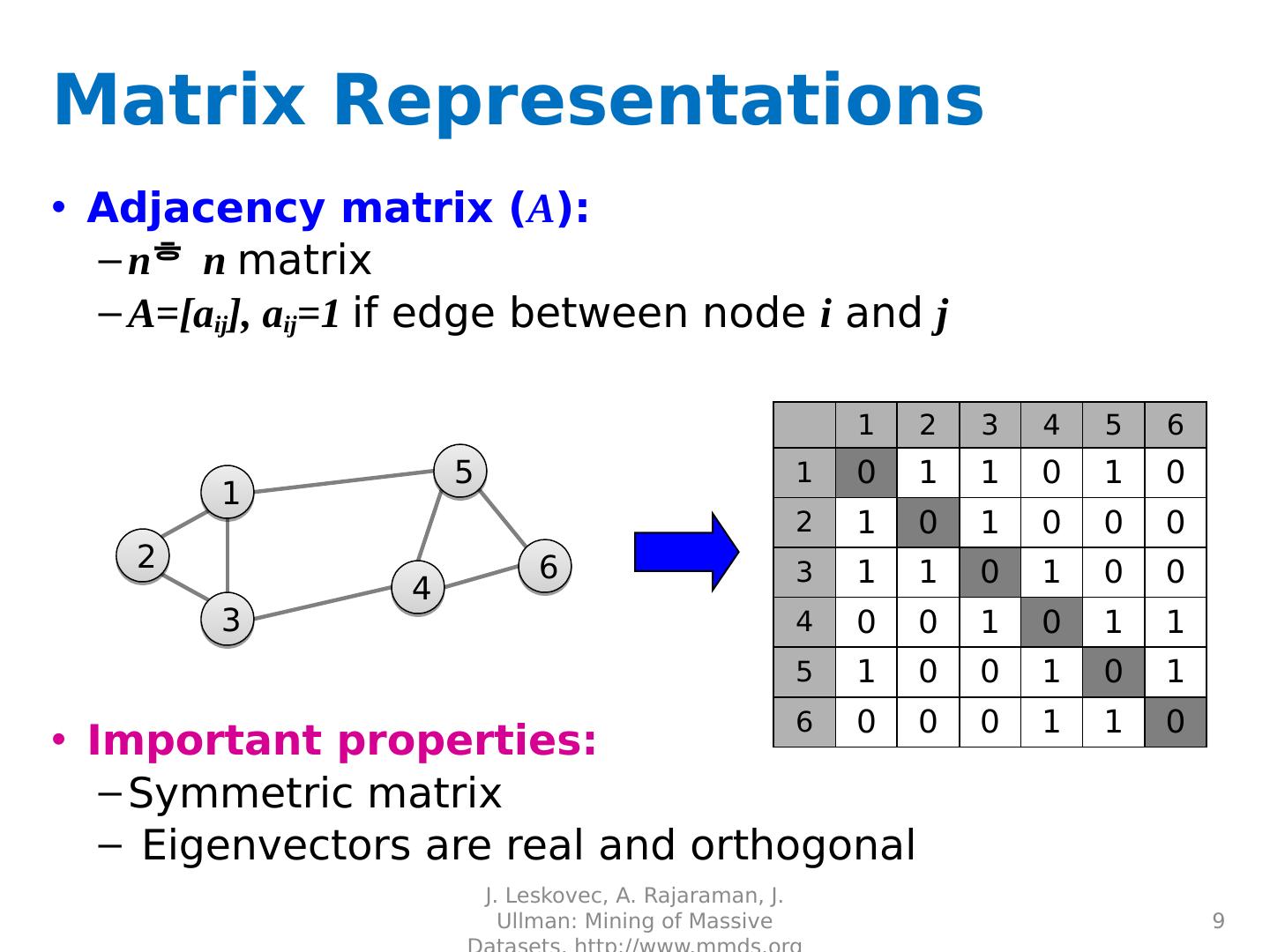 9 .Matrix Representations Adjacency matrix ( A ): n n matrix A=[ a ij ], a ij =1 if edge between node i and j Important properties: Symmetric matrix Eigenvectors are real and orthogonal J. Leskovec, A. Rajaraman, J. Ullman: Mining of Massive Datasets, http://www.mmds.org 9 1 3 2 5 4 6 1 2 3 4 5 6 1 0 1 1 0 1 0 2 1 0 1 0 0 0 3 1 1 0 1 0 0 4 0 0 1 0 1 1 5 1 0 0 1 0 1 6 0 0 0 1 1 0