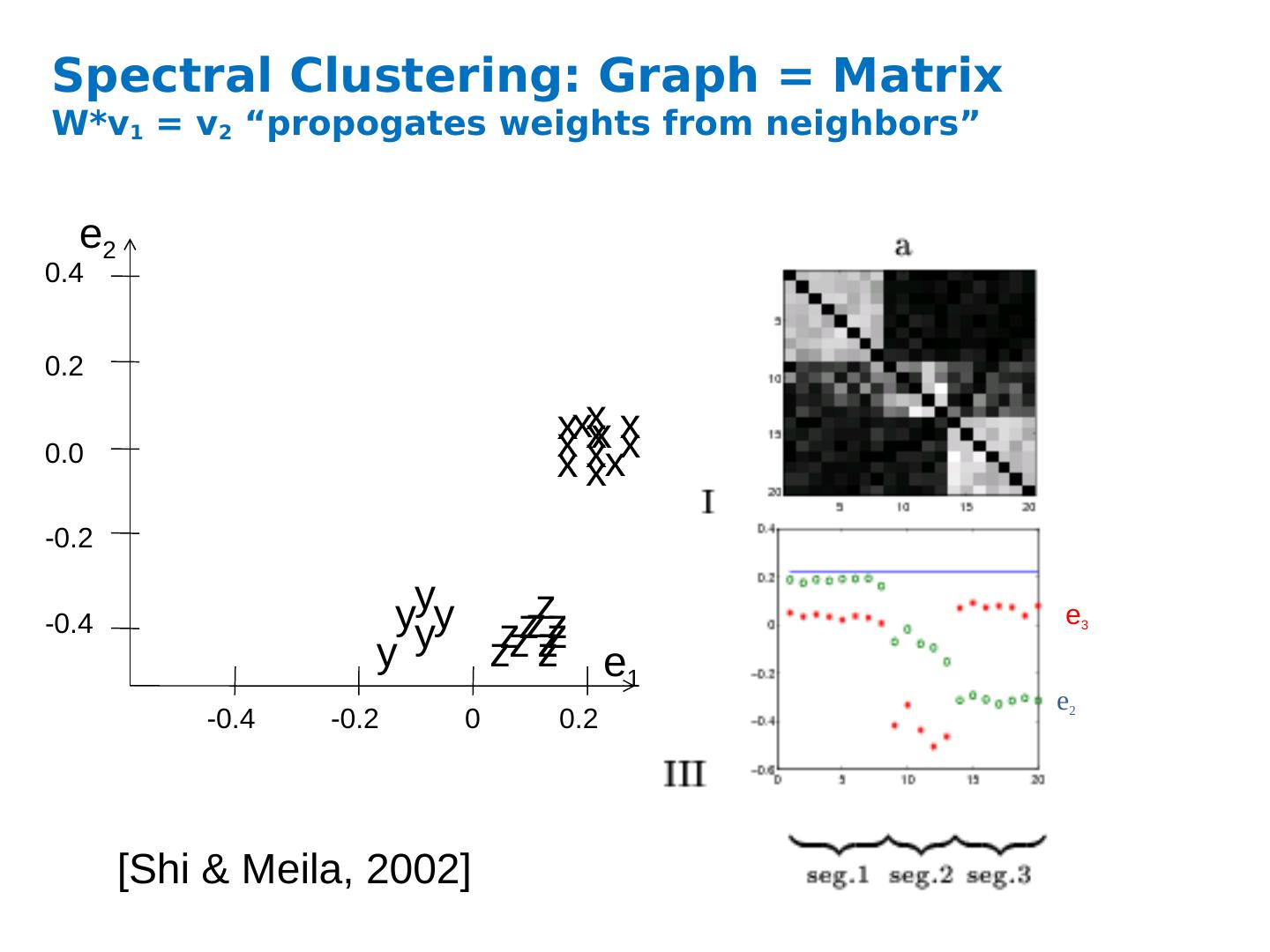 12 .Spectral Clustering: Graph = Matrix W*v 1 = v 2 “ propogates weights from neighbors” [Shi & Meila, 2002 ] e 2 e 3 -0.4 -0.2 0 0.2 -0.4 -0.2 0.0 0.2 0.4 x x x x x x y y y y y x x x x x x z z z z z z z z z z z e 1 e 2