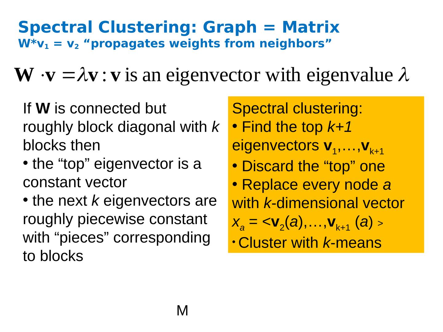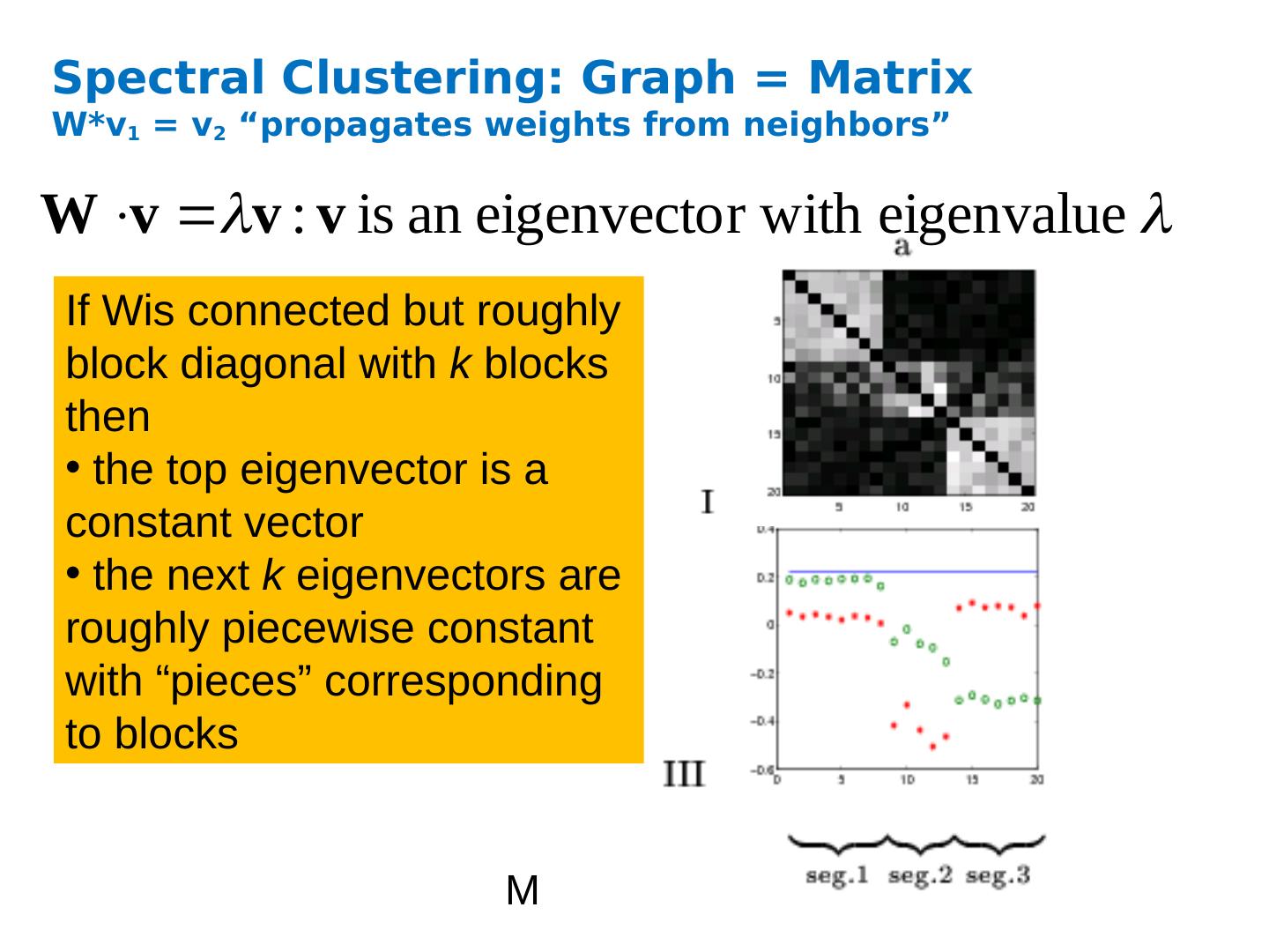 13 .Spectral Clustering: Graph = Matrix W*v 1 = v 2 “propagates weights from neighbors” M If Wis connected but roughly block diagonal with k blocks then the top eigenvector is a constant vector the next k eigenvectors are roughly piecewise constant with “pieces” corresponding to blocks
