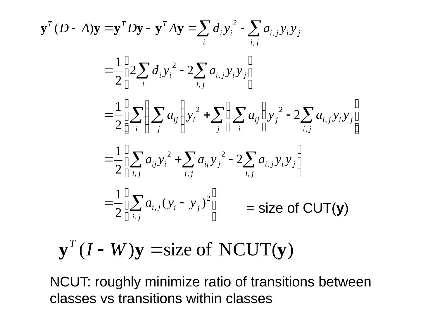 16 .= size of CUT( y ) NCUT: roughly minimize ratio of transitions between classes vs transitions within classes