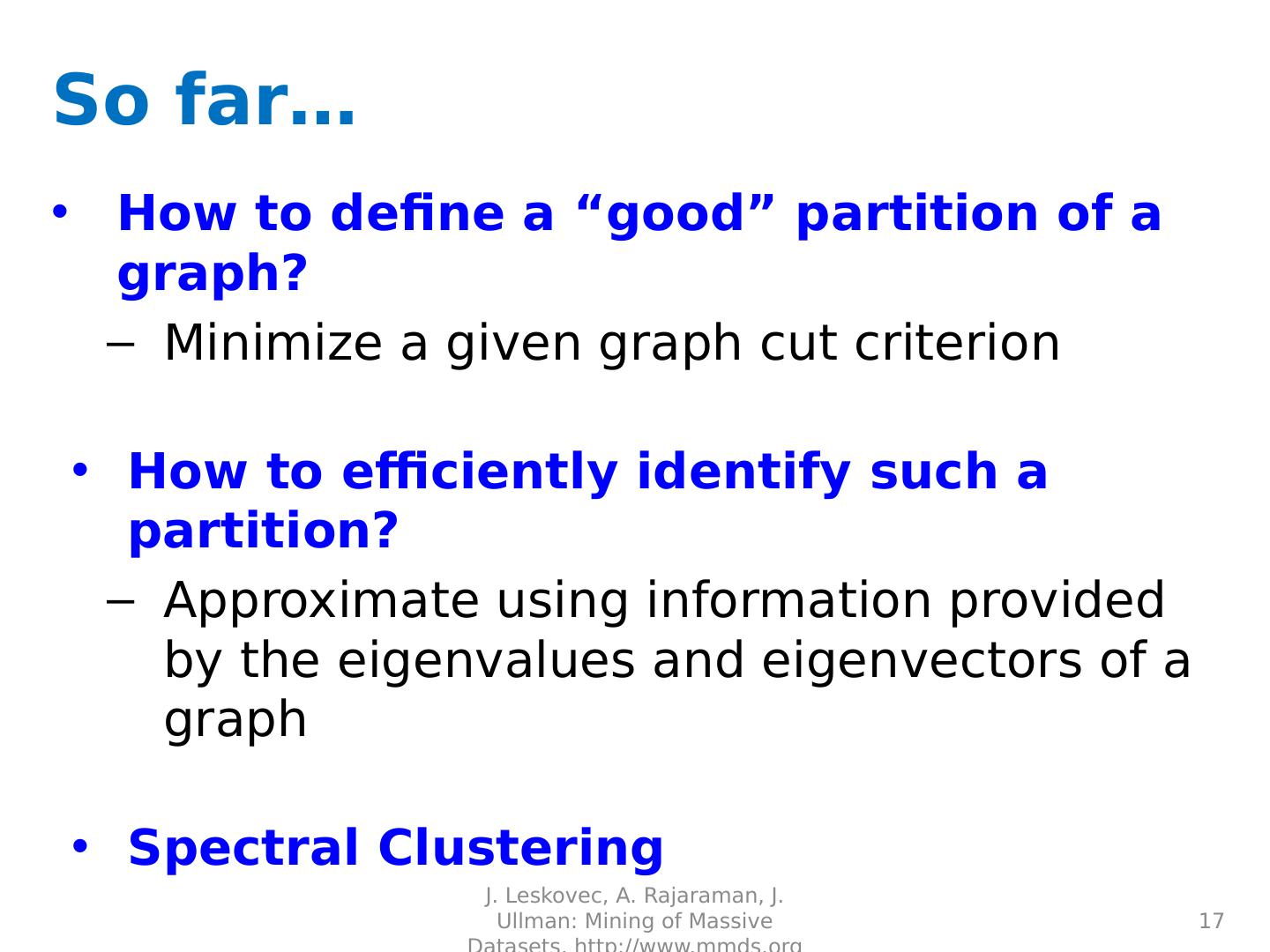 6 .Graph Cut Criteria Criterion: Normalized-cut [Shi-Malik, ’97] Connectivity between groups relative to the density of each group : total weight of the edges with at least one endpoint in : Why use this criterion? Produces more balanced partitions How do we efficiently find a good partition? Problem: Computing optimal cut is NP-hard J. Leskovec, A. Rajaraman, J. Ullman: Mining of Massive Datasets, http://www.mmds.org 6 [Shi- Malik ]
