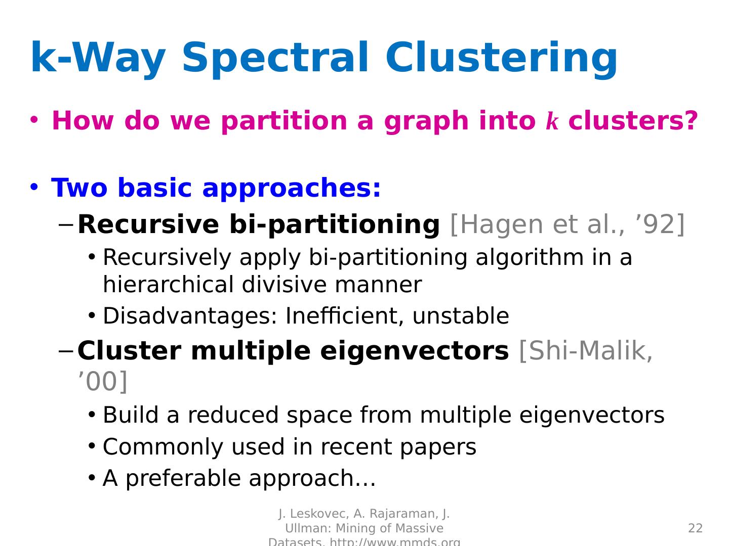 22 .k-Way Spectral Clustering How do we partition a graph into k clusters? Two basic approaches: Recursive bi-partitioning [Hagen et al., ’92] Recursively apply bi-partitioning algorithm in a hierarchical divisive manner Disadvantages: Inefficient, unstable Cluster multiple eigenvectors [Shi- Malik , ’00] Build a reduced space from multiple eigenvectors Commonly used in recent papers A preferable approach… J. Leskovec, A. Rajaraman, J. Ullman: Mining of Massive Datasets, http://www.mmds.org 22
