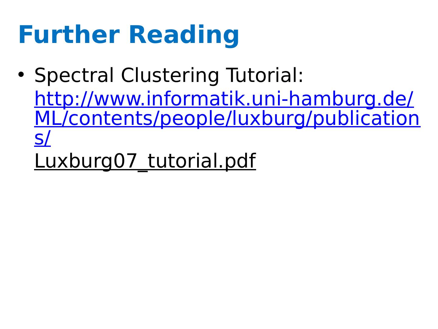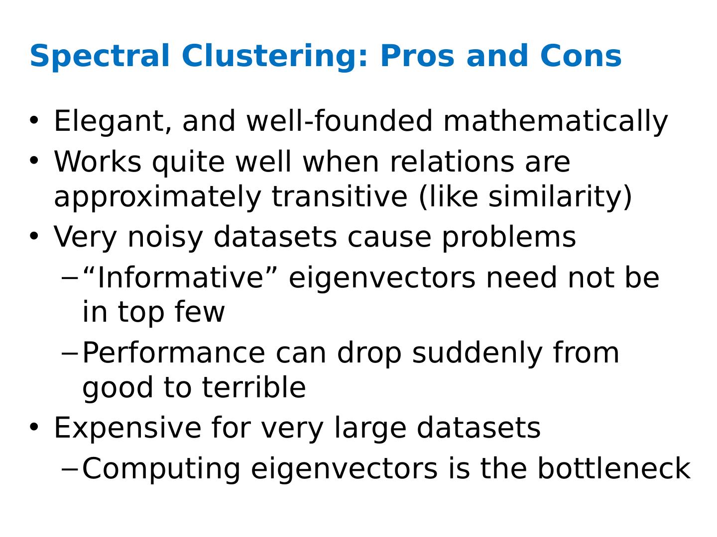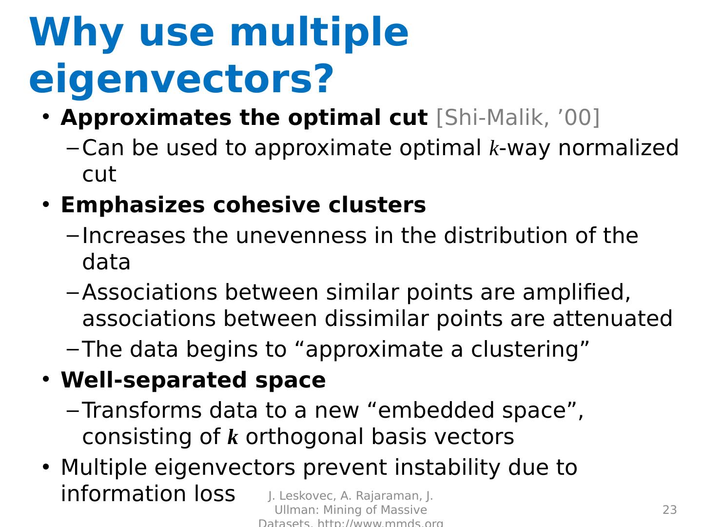 23 .Why use multiple eigenvectors? Approximates the optimal cut [Shi- Malik , ’00] Can be used to approximate optimal k -way normalized cut Emphasizes cohesive clusters Increases the unevenness in the distribution of the data Associations between similar points are amplified, associations between dissimilar points are attenuated The data begins to “approximate a clustering” Well-separated space Transforms data to a new “embedded space”, consisting of k orthogonal basis vectors Multiple eigenvectors prevent instability due to information loss J. Leskovec, A. Rajaraman, J. Ullman: Mining of Massive Datasets, http://www.mmds.org 23