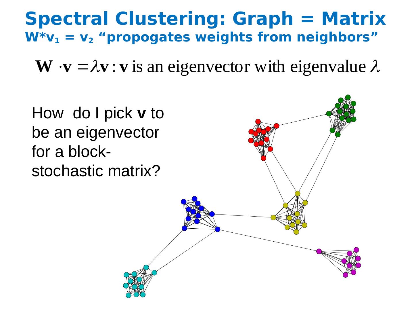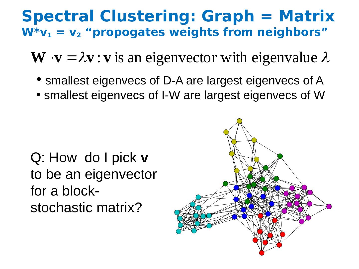 25 .Spectral Clustering: Graph = Matrix W*v 1 = v 2 “ propogates weights from neighbors” How do I pick v to be an eigenvector for a block-stochastic matrix?