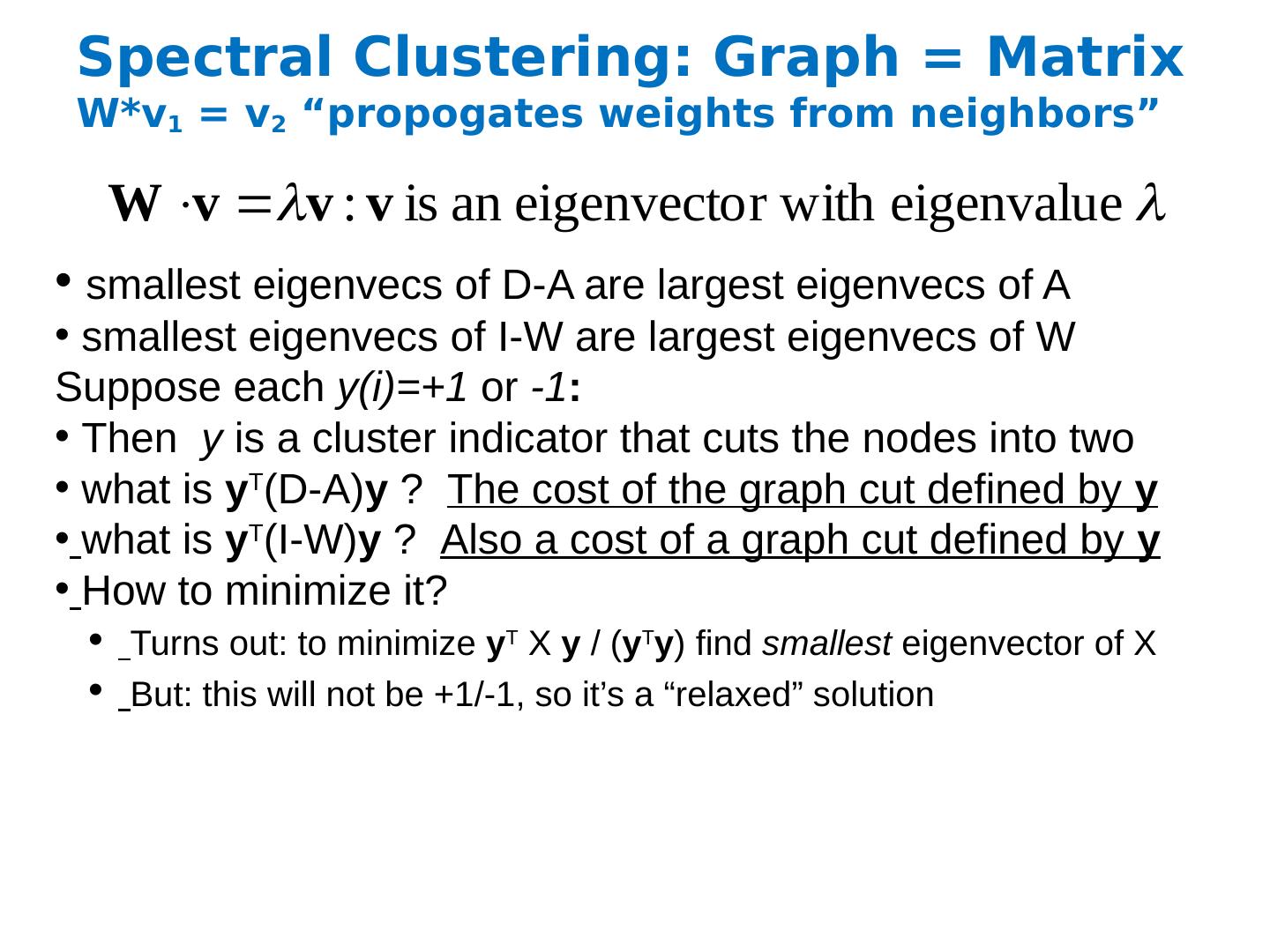 15 .Spectral Clustering: Graph = Matrix W*v 1 = v 2 “ propogates weights from neighbors” smallest eigenvecs of D-A are largest eigenvecs of A smallest eigenvecs of I-W are largest eigenvecs of W Suppose each y(i)=+1 or -1 : Then y is a cluster indicator that splits the nodes into two what is y T (D-A) y ?