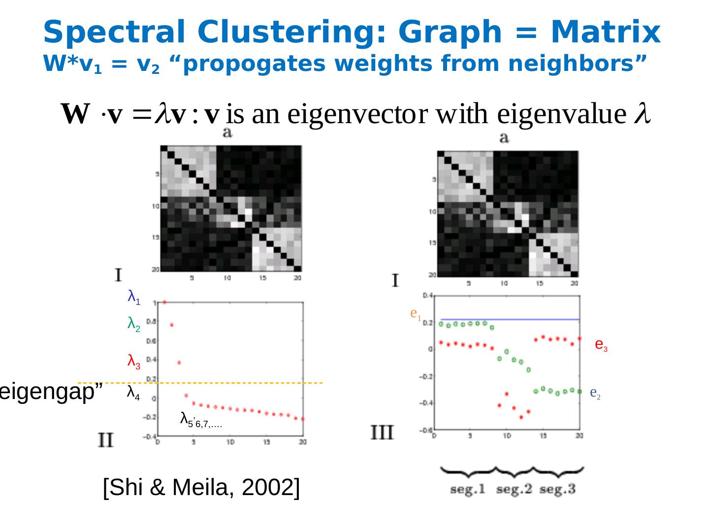 27 .Spectral Clustering: Graph = Matrix W*v 1 = v 2 “ propogates weights from neighbors” [Shi & Meila, 2002 ] λ 2 λ 3 λ 4 λ 5 , 6 ,7,…. λ 1 e 1 e 2 e 3 “ eigengap ”