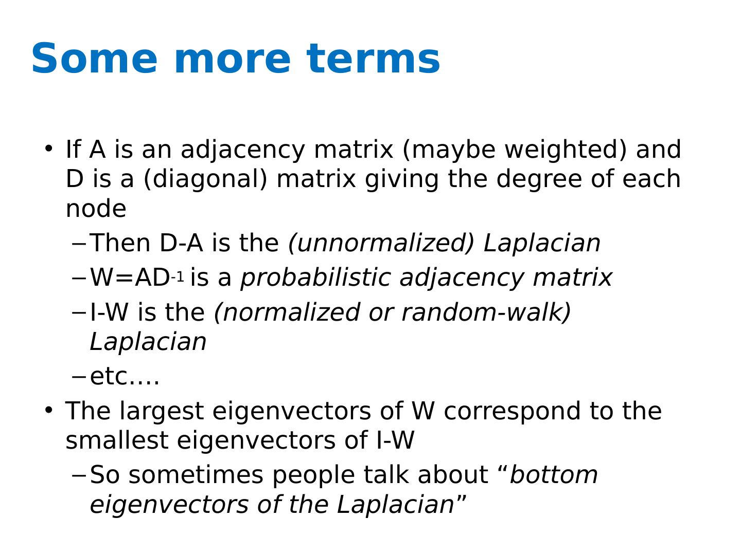 28 .Some more terms If A is an adjacency matrix (maybe weighted) and D is a (diagonal) matrix giving the degree of each node Then D-A is the ( unnormalized ) Laplacian W=AD -1 is a probabilistic adjacency matrix I-W is the (normalized or random-walk) Laplacian etc…. The largest eigenvectors of W correspond to the smallest eigenvectors of I-W So sometimes people talk about “ bottom eigenvectors of the Laplacian ”
