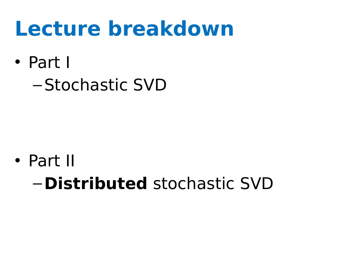 2 .Lecture breakdown Part I Stochastic SVD Part II Distributed stochastic SVD