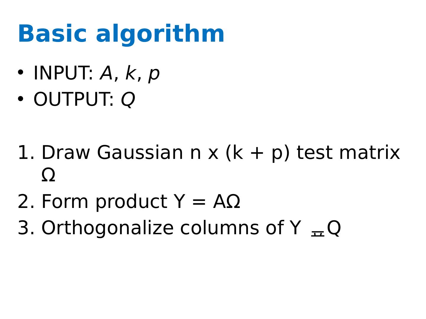 5 .Basic algorithm INPUT: A , k , p OUTPUT: Q Draw Gaussian n x (k + p) test matrix Ω Form product Y = AΩ Orthogonalize columns of Y Q