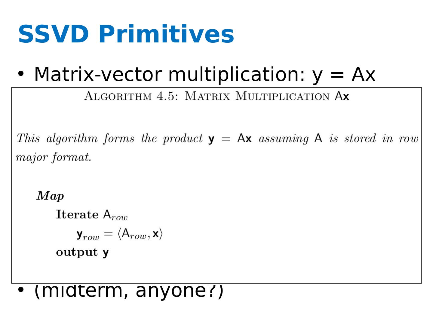 15 .SSVD Primitives Matrix-vector multiplication: y = Ax (midterm, anyone?)