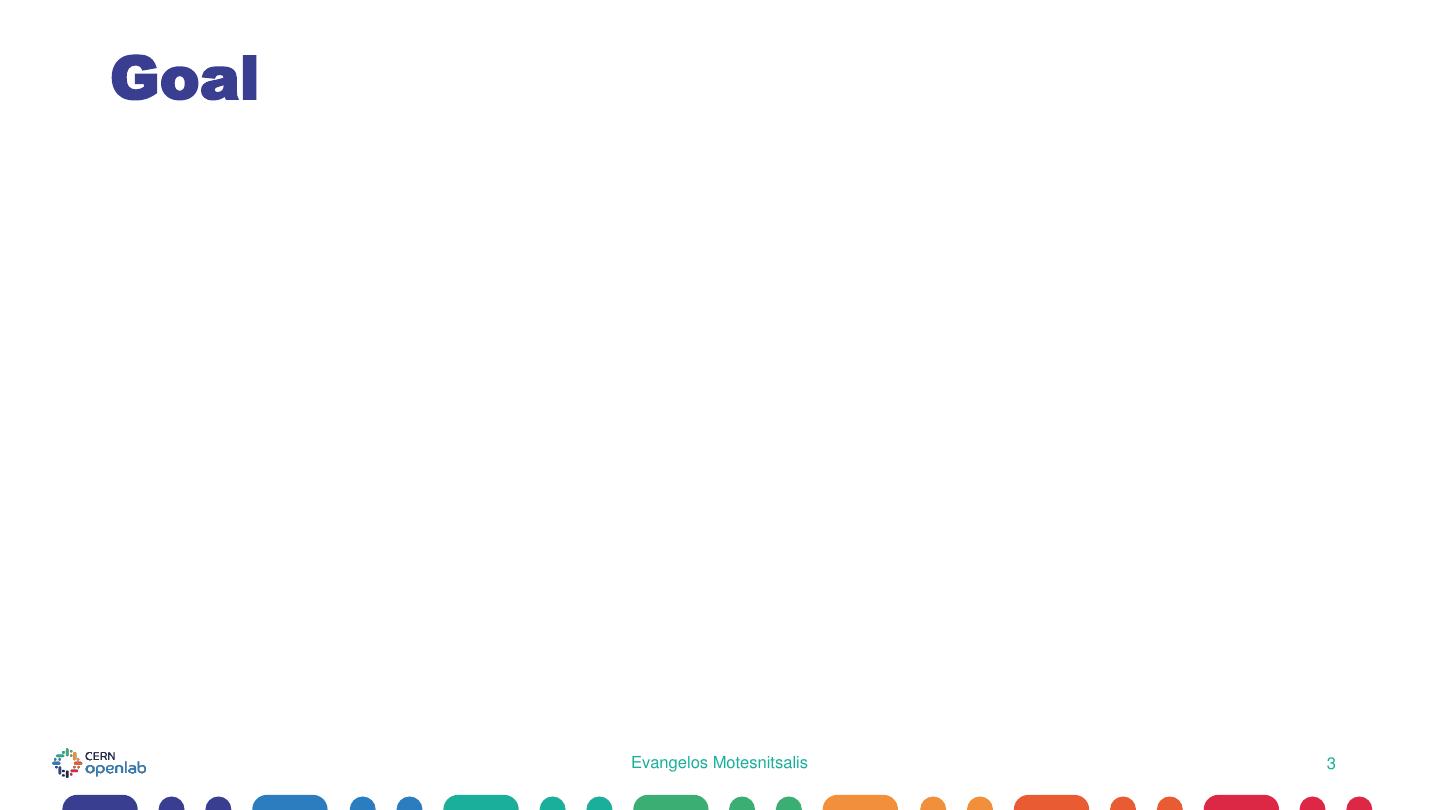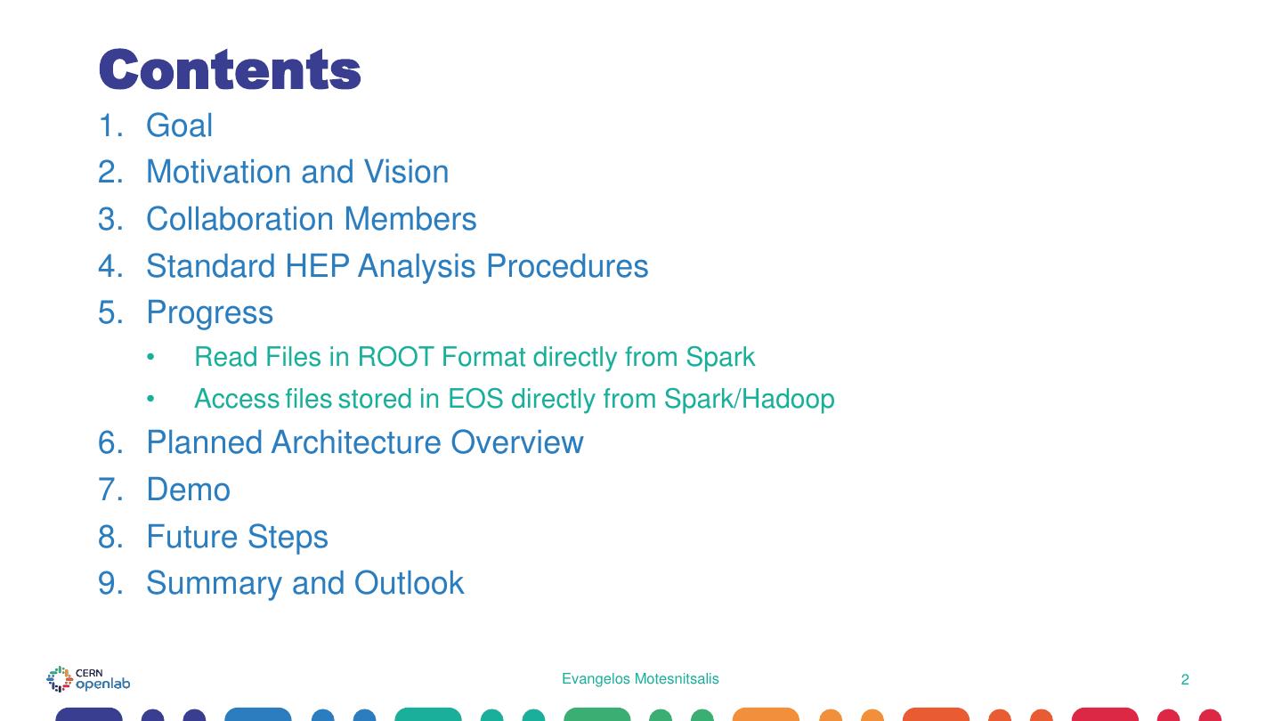 2 .Contents 1. Goal 2. Motivation and Vision 3. Collaboration Members 4. Standard HEP Analysis Procedures 5. Progress • Read Files in ROOT Format directly from Spark • Access files stored in EOS directly from Spark/Hadoop 6. Planned Architecture Overview 7. Demo 8. Future Steps 9. Summary and Outlook Evangelos Motesnitsalis 2
