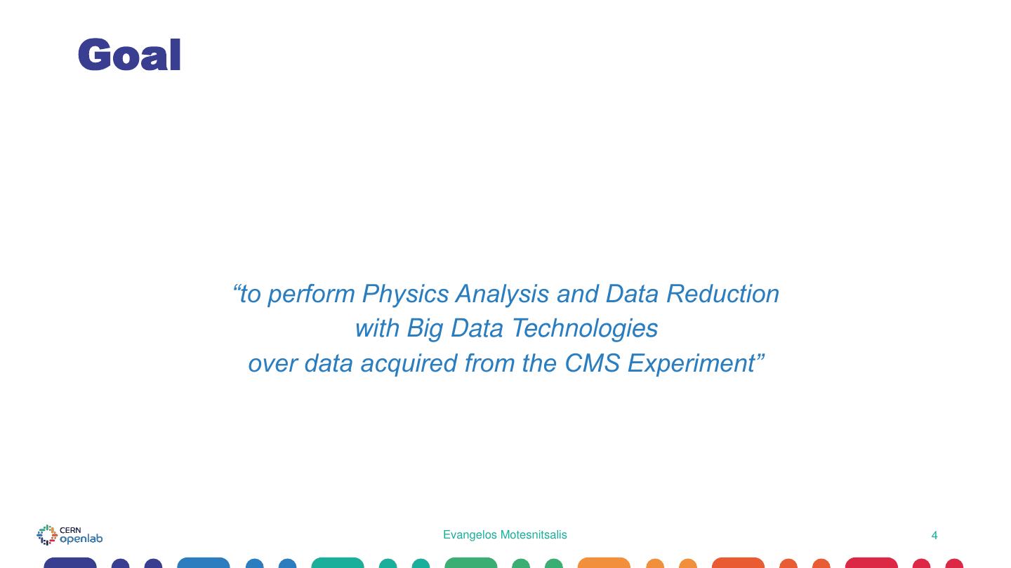 4 .Goal “to perform Physics Analysis and Data Reduction with Big Data Technologies over data acquired from the CMS Experiment” Evangelos Motesnitsalis 4