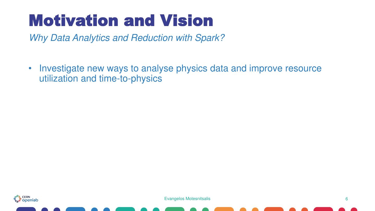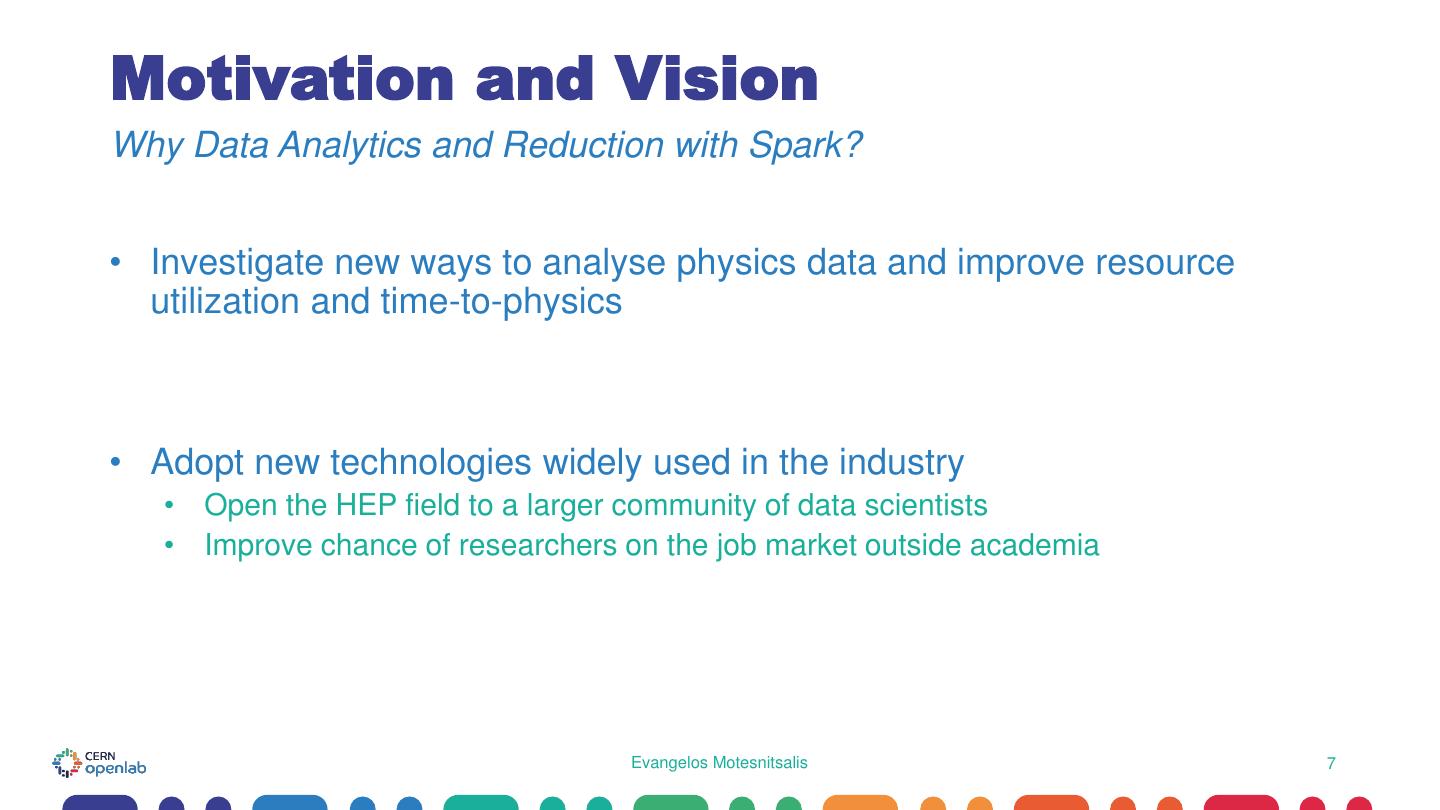 6 .Motivation and Vision Why Data Analytics and Reduction with Spark? • Investigate new ways to analyse physics data and improve resource utilization and time-to-physics Evangelos Motesnitsalis 6