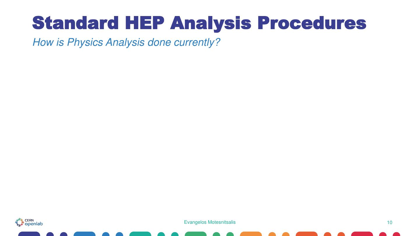 13 .Standard HEP Analysis Procedures How is Physics Analysis done currently? Until today, the vast majority of high energy physics analysis is done with the ROOT Framework which uses physics data that are stored in ROOT format files, within the EOS Storage Service of CERN. ROOT Data Analysis Framework A modular scientific software framework which provides all the functionalities needed to deal with big data processing, statistical analysis, visualization and file storage. It is mainly written in C++ but also integrated with Python and R. EOS Service A disk-based, low-latency storage service with a highly-scalable hierarchical namespace, which enables data access through the XROOT protocol. It provides storage for both physics and user use cases via different service instances such as EOSPUBLIC, EOSATLAS, EOSCMS. Evangelos Motesnitsalis 13