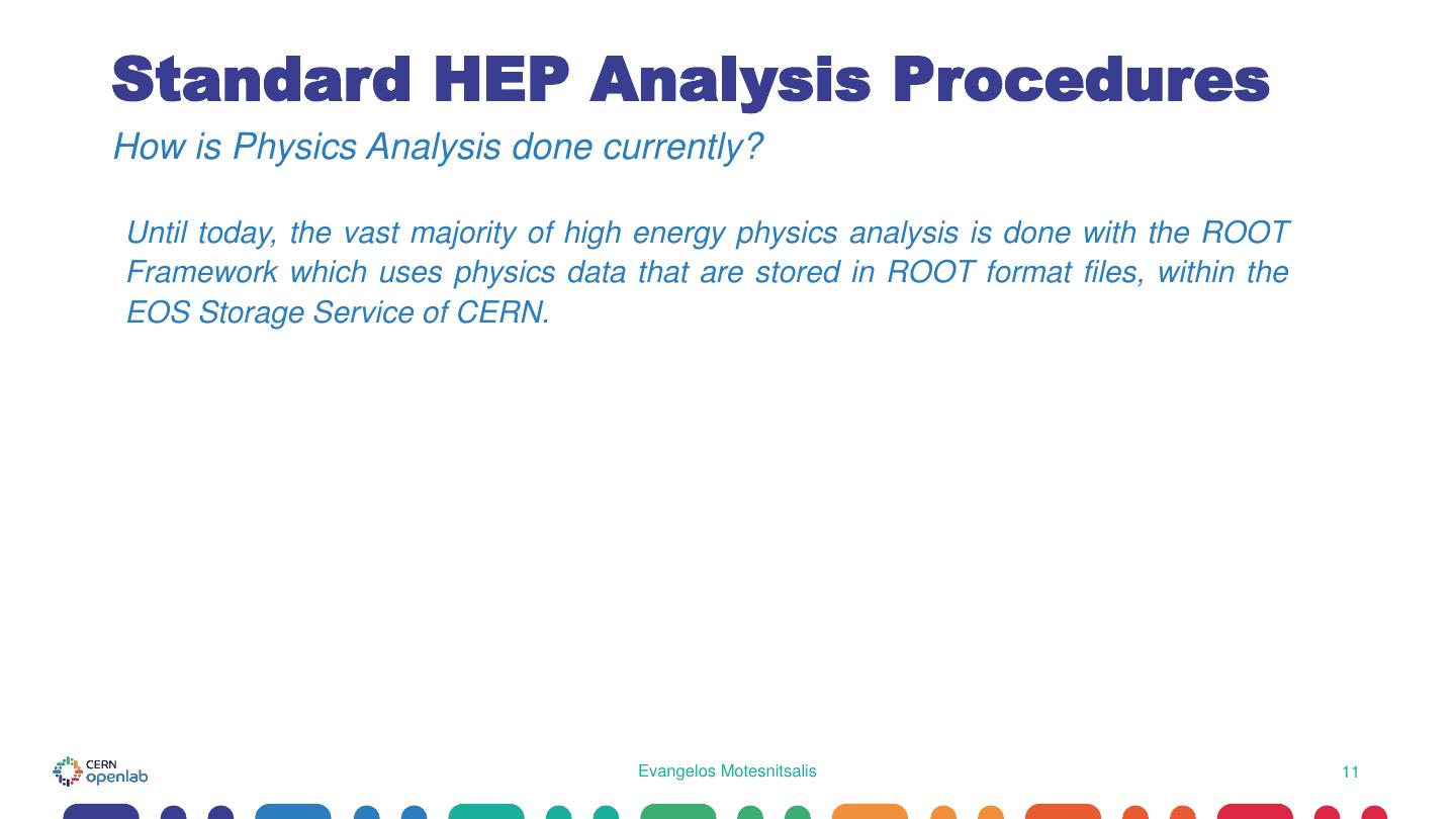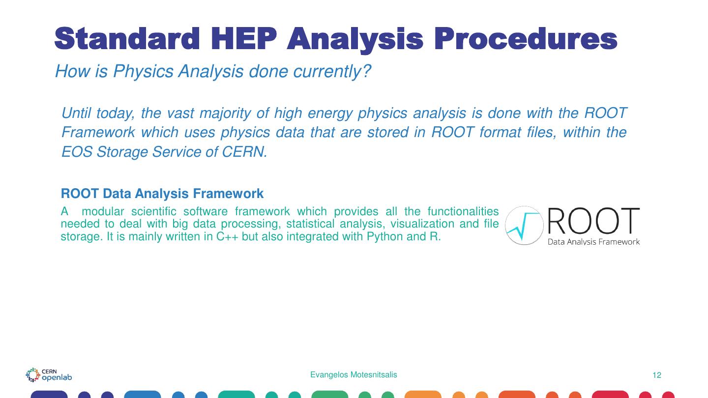 11 .Standard HEP Analysis Procedures How is Physics Analysis done currently? Until today, the vast majority of high energy physics analysis is done with the ROOT Framework which uses physics data that are stored in ROOT format files, within the EOS Storage Service of CERN. Evangelos Motesnitsalis 11