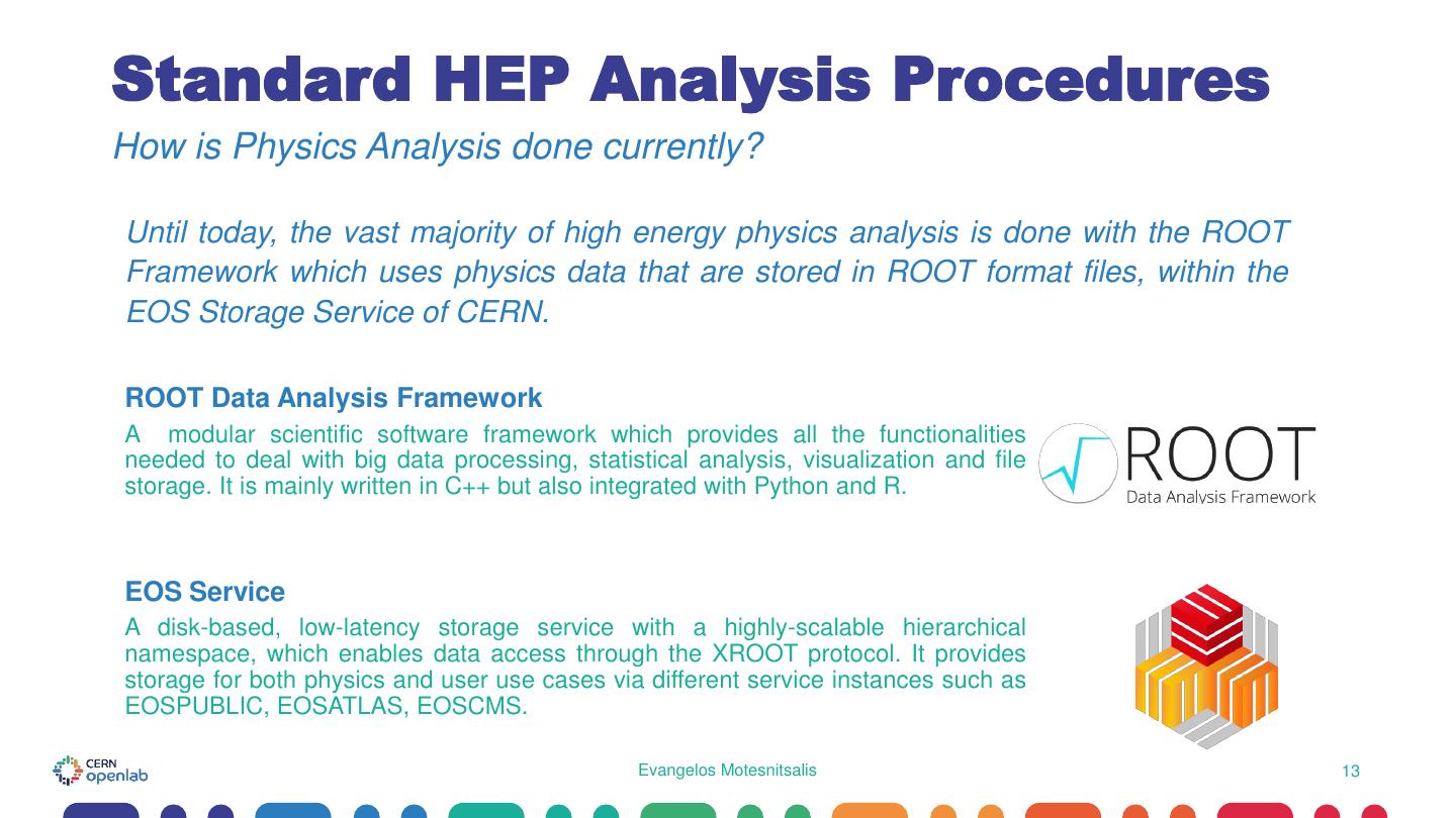 12 .Standard HEP Analysis Procedures How is Physics Analysis done currently? Until today, the vast majority of high energy physics analysis is done with the ROOT Framework which uses physics data that are stored in ROOT format files, within the EOS Storage Service of CERN. ROOT Data Analysis Framework A modular scientific software framework which provides all the functionalities needed to deal with big data processing, statistical analysis, visualization and file storage. It is mainly written in C++ but also integrated with Python and R. Evangelos Motesnitsalis 12