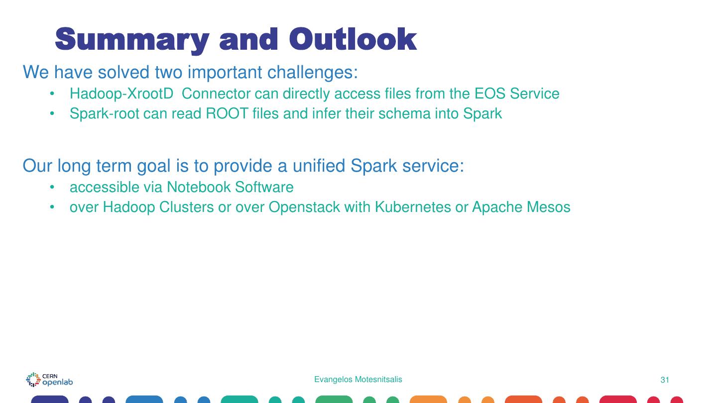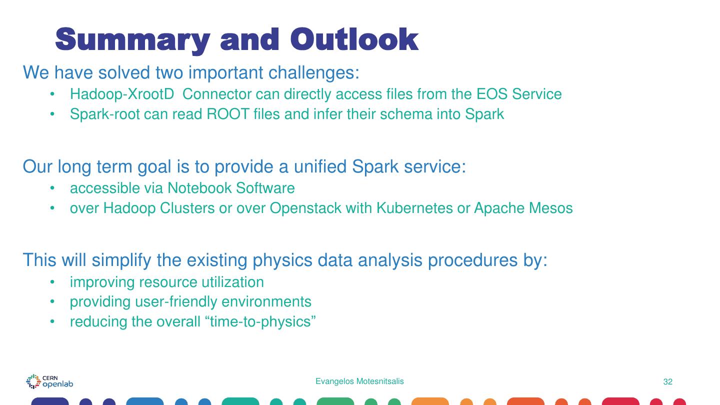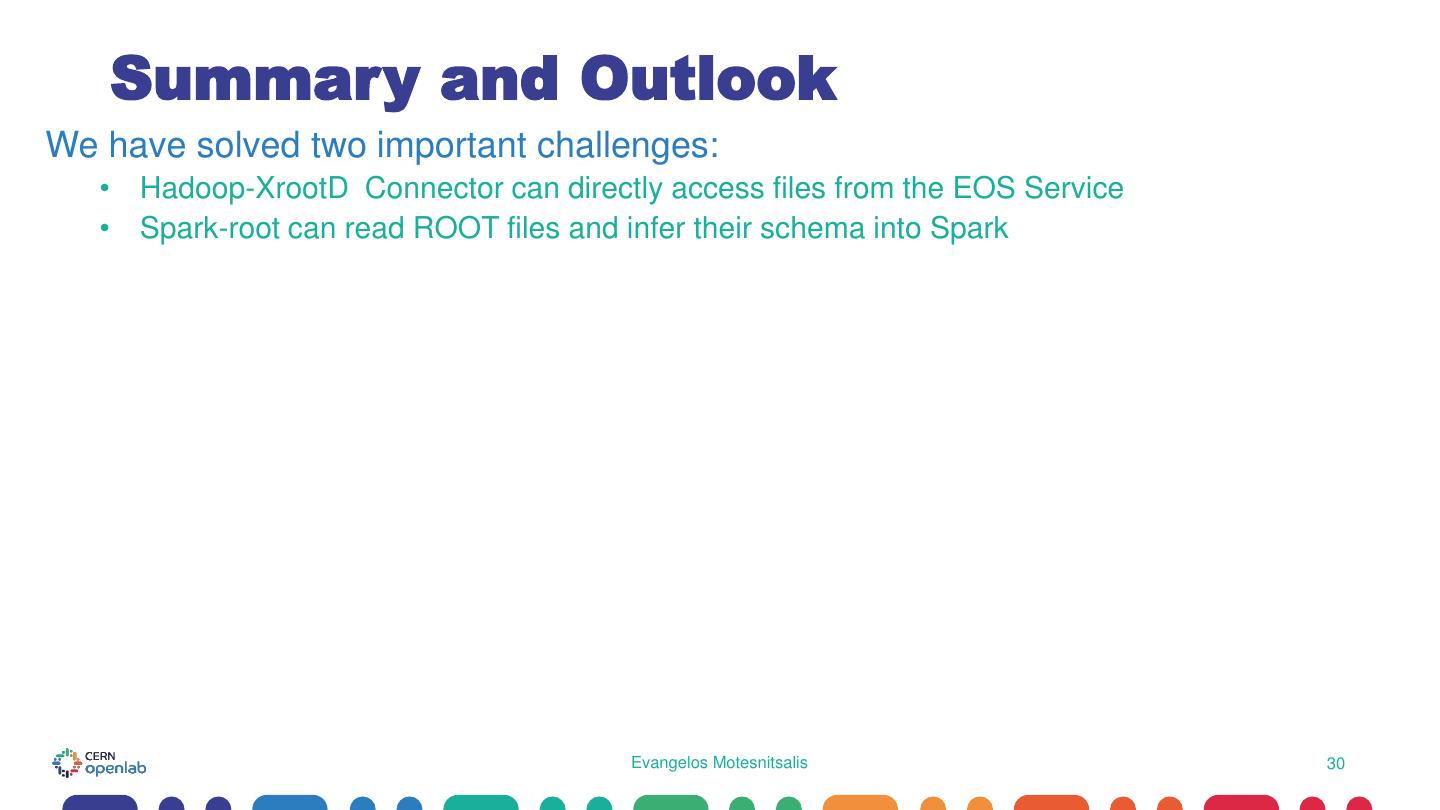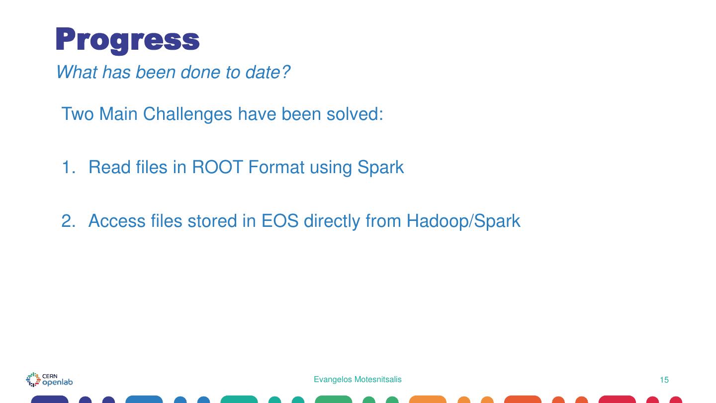 15 .Progress What has been done to date? Two Main Challenges have been solved: 1. Read files in ROOT Format using Spark 2. Access files stored in EOS directly from Hadoop/Spark Evangelos Motesnitsalis 15