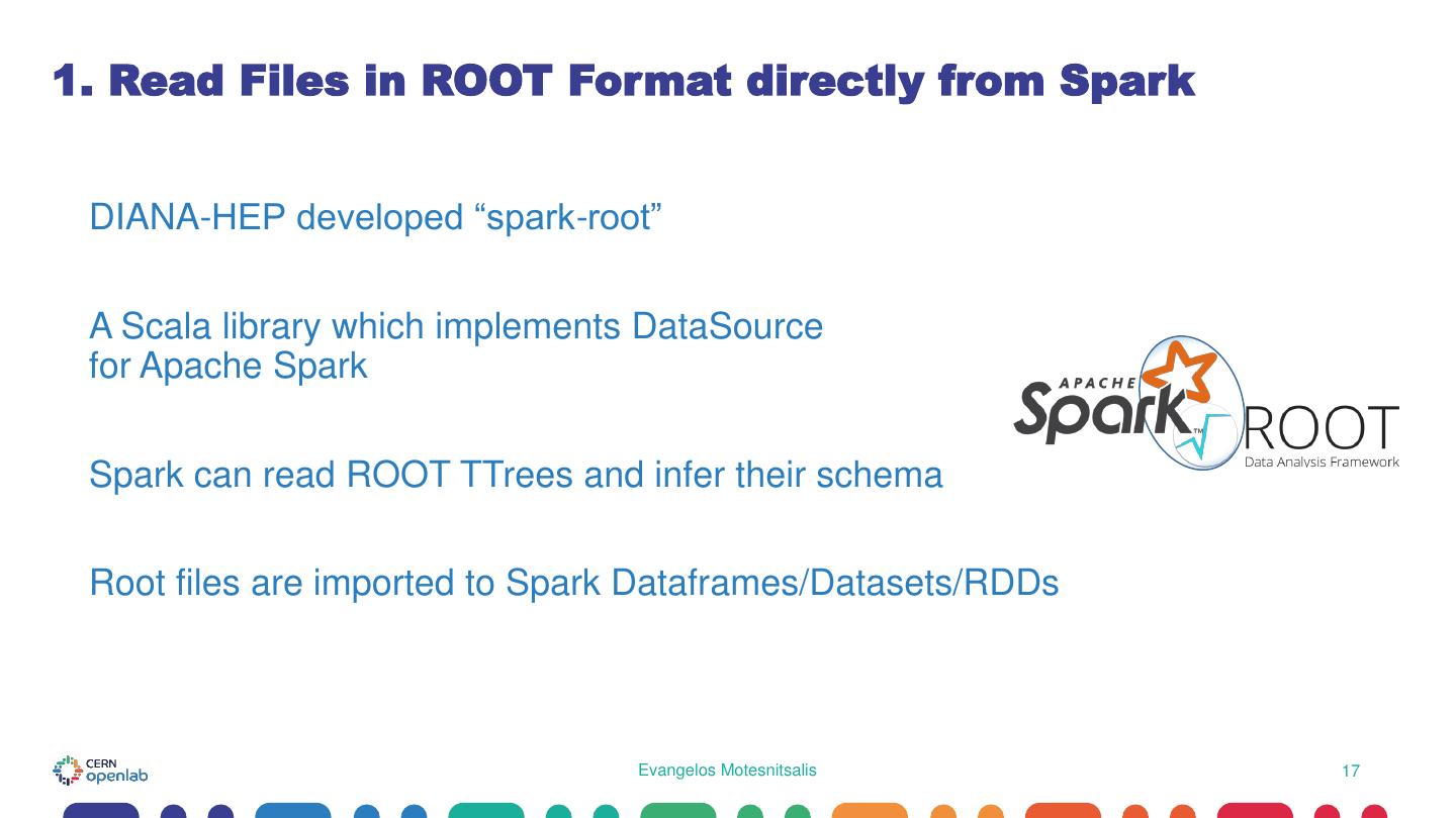 17 .1. Read Files in ROOT Format directly from Spark DIANA-HEP developed “spark-root” A Scala library which implements DataSource for Apache Spark Spark can read ROOT TTrees and infer their schema Root files are imported to Spark Dataframes/Datasets/RDDs Evangelos Motesnitsalis 17