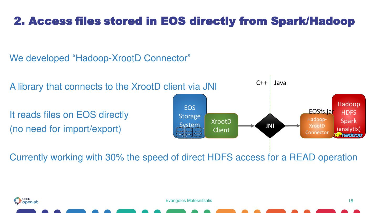 18 . 2. Access files stored in EOS directly from Spark/Hadoop We developed “Hadoop-XrootD Connector” C++ Java A library that connects to the XrootD client via JNI Hadoop EOS EOSfs.jar HDFS It reads files on EOS directly Storage Hadoop- XrootD Xrootd Spark System JNI XrootD (no need for import/export) Client Connector (analytix) Currently working with 30% the speed of direct HDFS access for a READ operation Evangelos Motesnitsalis 18