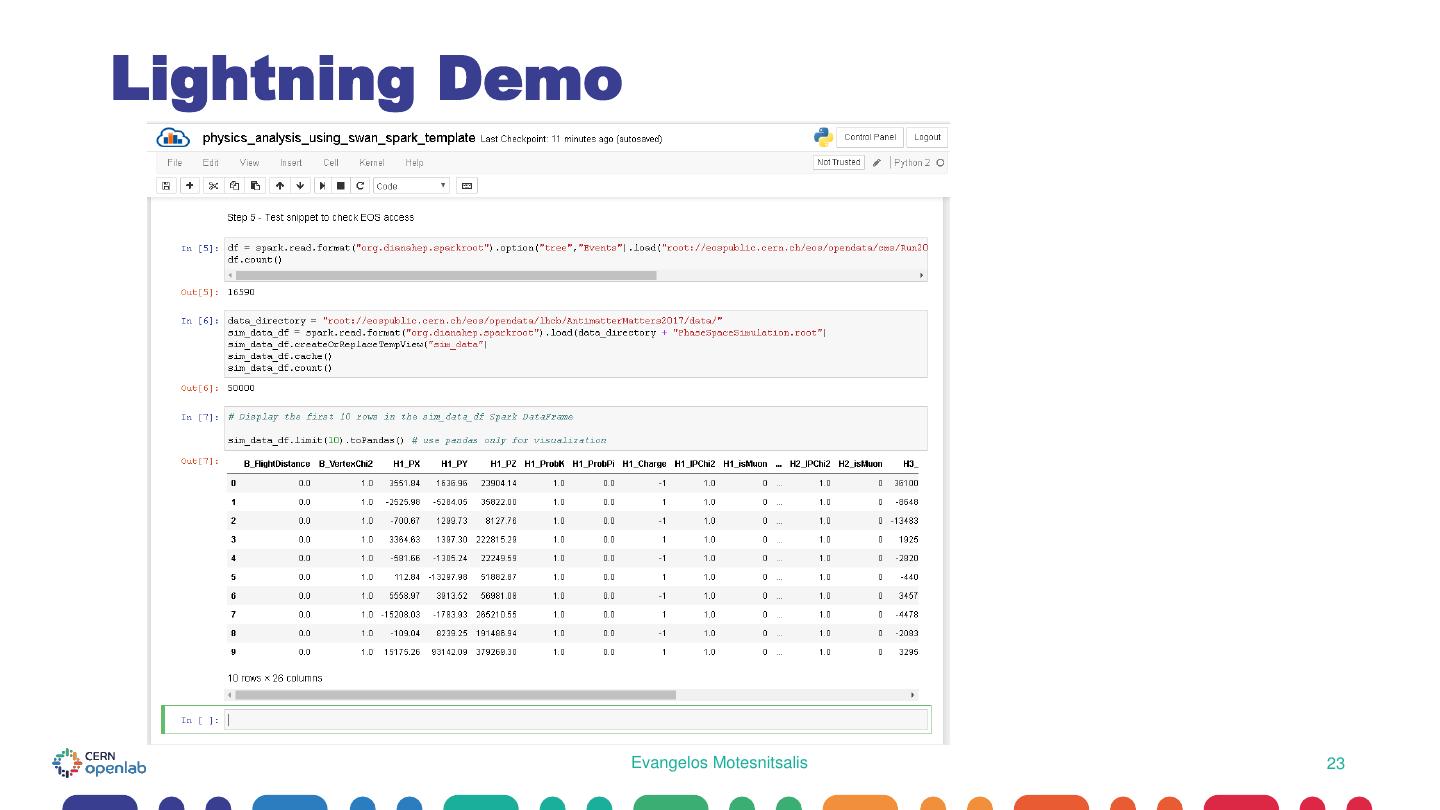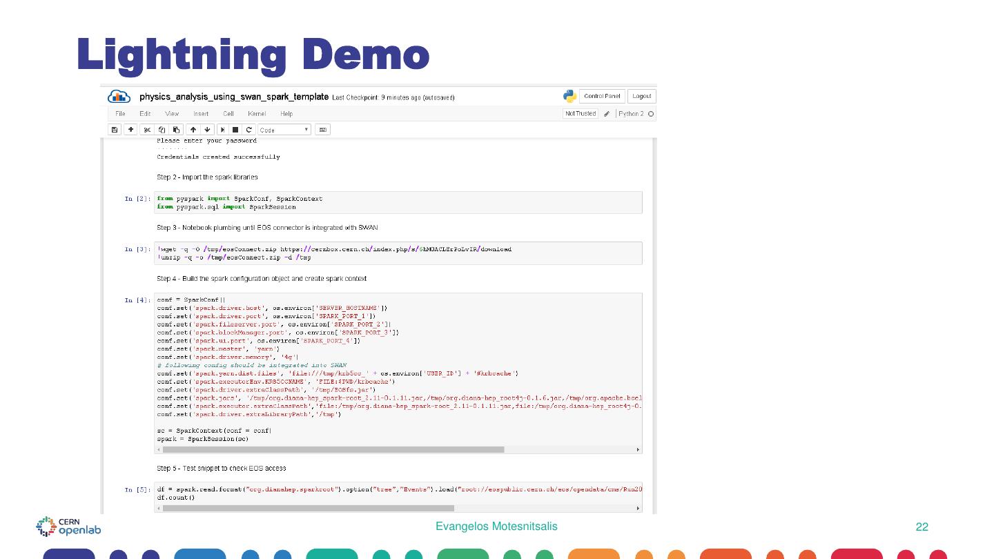 16 .Progress What has been done to date? Two Main Challenges have been solved: 1. Read files in ROOT Format using Spark 2. Access files stored in EOS directly from Hadoop/Spark We now have fully functioning Analysis & Reduction examples tested over CMS Open Data (1 TB) Evangelos Motesnitsalis 16